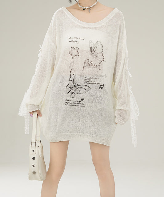 【HOOK】for girls バタフライプリント袖レースリボンライン透かしニットソー