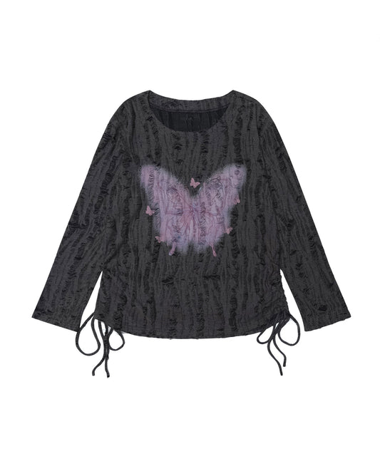 【HOOK】for girls リボンタイ付きバタフライプリントサイドシャーリングダメージ透かしニットソー
