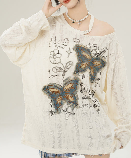 【HOOK】for girls バタフライパッチアシンメトリー透かしニットソー