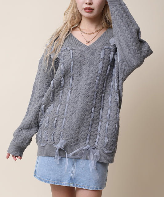 【HOOK】for girls ケーブル編みリボン通しデザインニット