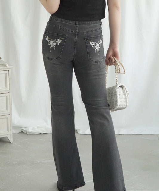 【Jasmine】フラワー刺しゅうフレアハイウエストデニムパンツ