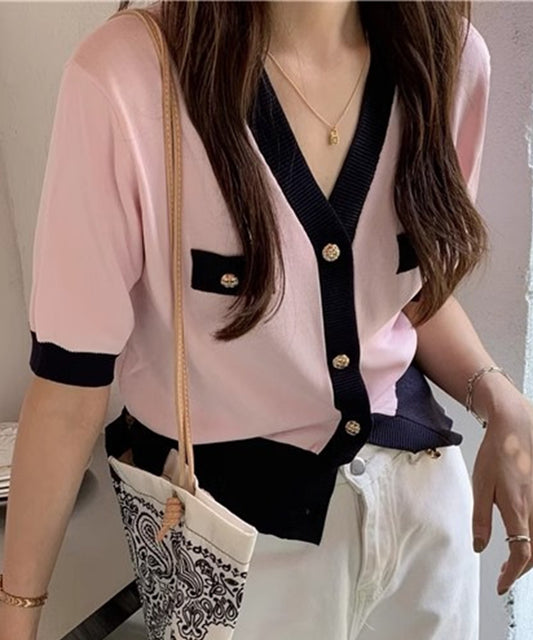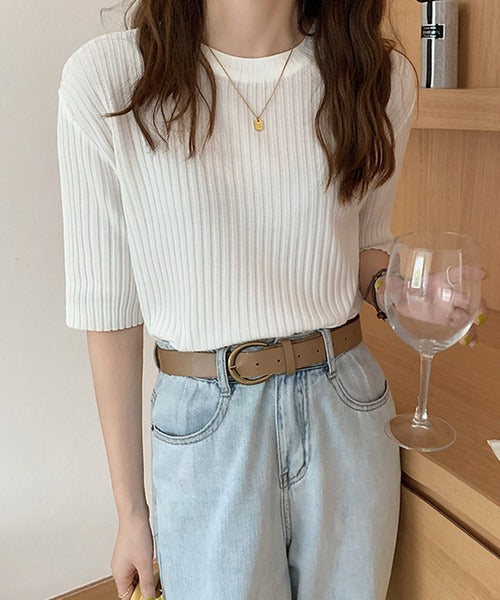 【Jasmine】シンプル無地Vネック半袖ニットトップス