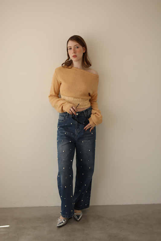 【Jasmine】パール付きハイウエストワイドデニムパンツ