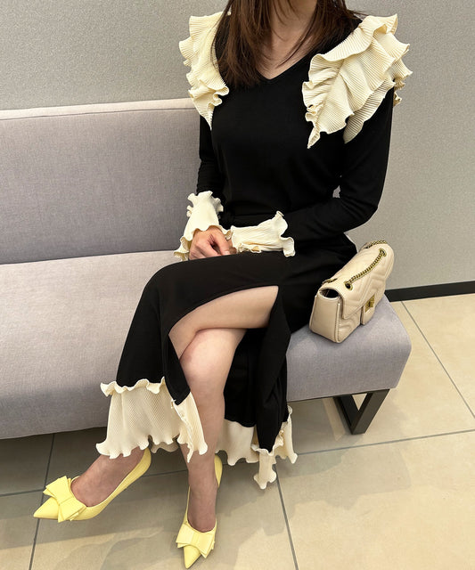 【Jasmine】肩リボンハートネックタイトニットロングワンピース