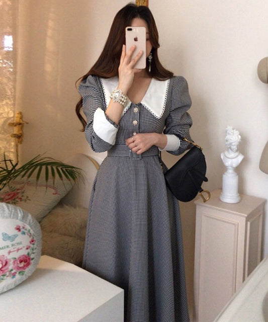 【Jasmine】ギンガムチェックフレンチガーリーブラウスフレアワンピース
