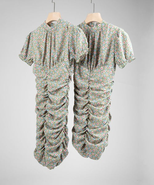 【Jasmine】スタンドカラー半袖パワショル花柄半袖ワンピース