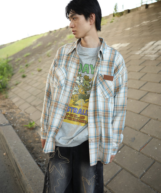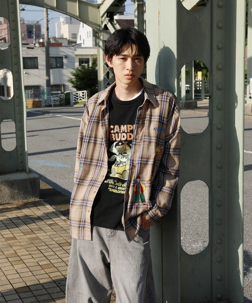 HOOK -original- レトロ古着風 キャラクター刺繍チェックシャツ