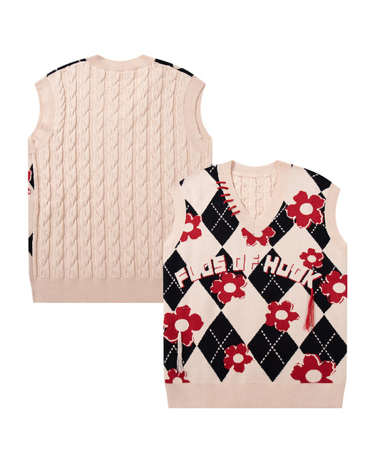 HOOK -original-花とアーガイル模様クレイジーステッチニットベスト