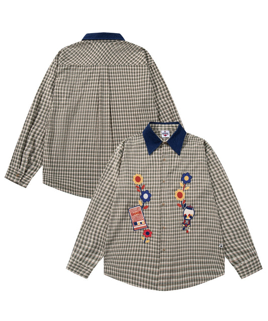 HOOK -original- レトロ調花パッチワーク刺繍チェック柄長袖シャツ