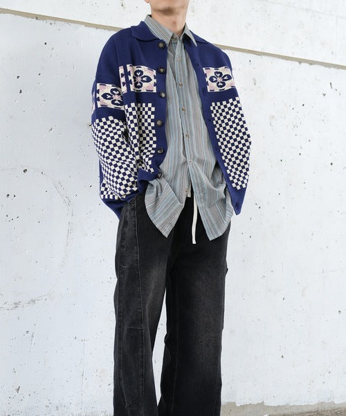 HOOK -original-幾何学模様ポロ襟前開きニットカーディガン