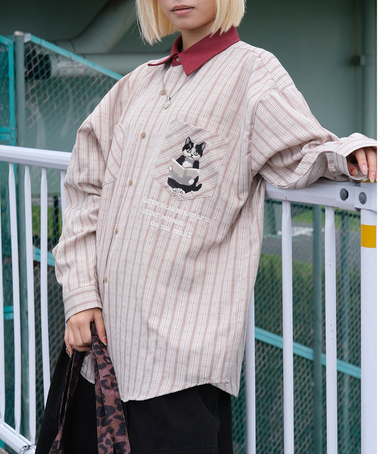 HOOK -original- ニャンコ刺繍チェック柄デニム襟長袖オーバーシャツ