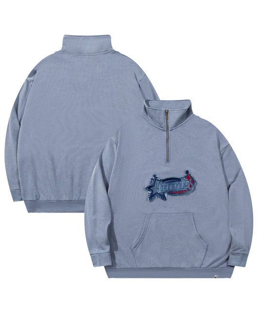 HOOK -original- アメカジパッチ刺繍デニム風ウォッシュハーフジップ