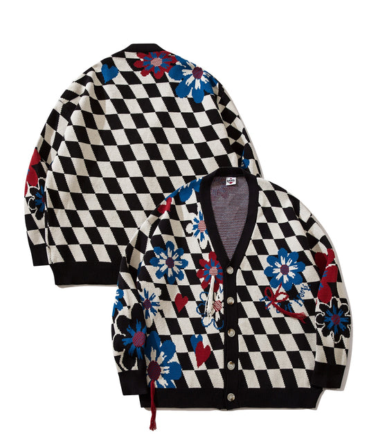 HOOK -original- ブロックチェック花模様フリンジカーディガン