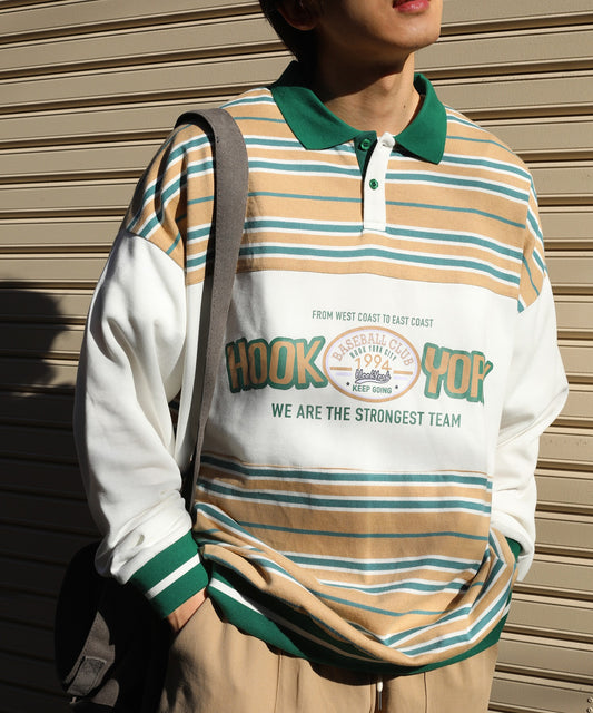 【HOOK -original- 】アメカジヴィンテージ風プリントボーダー切り替えポロ襟スウェット