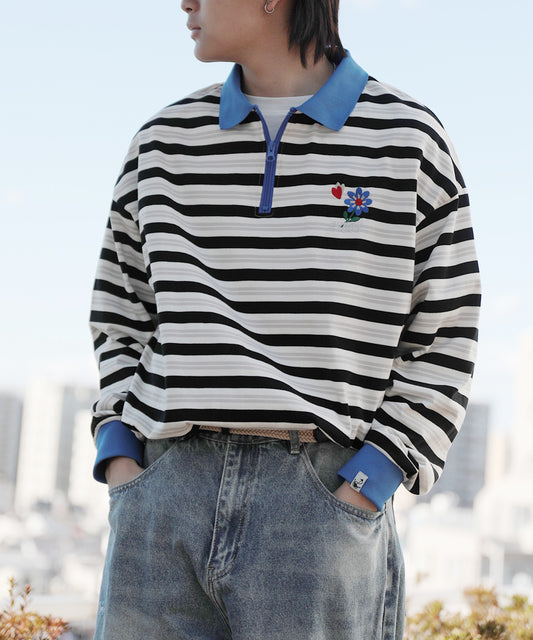 【HOOK -original- 】バイカラー花刺繍マルチボーダーポロ襟ロンTEE