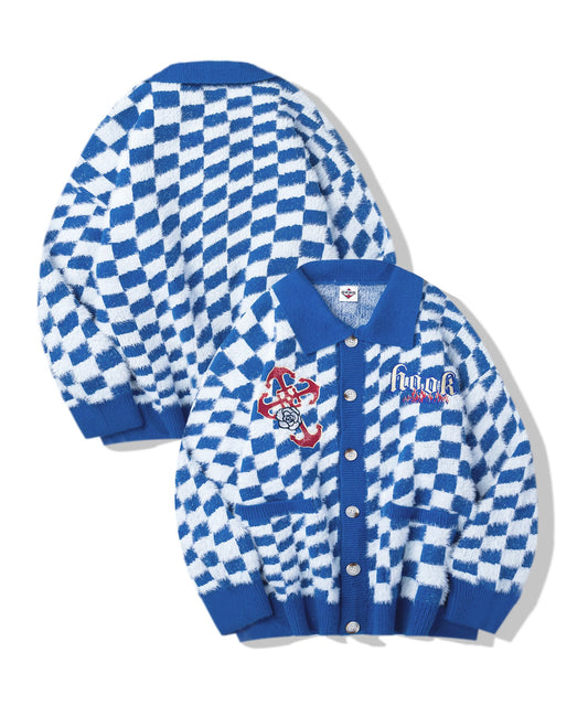 【HOOK -original- 】ブロックチェックワッペン刺繍ポロ襟シャギーニットカーディガン