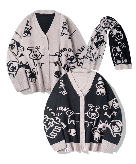【HOOK -original- 】2WAYリバーシブルワンちゃんニットカーディガン マフラー付き