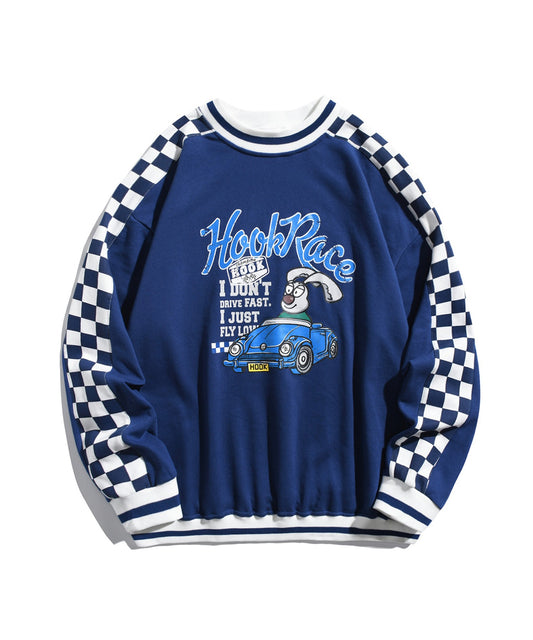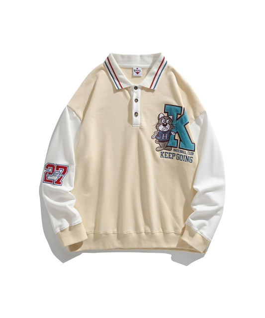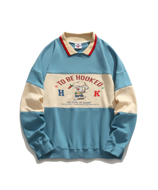 【HOOK -original- 】アメカジカートゥーン風プリント袖切り替えポロ襟スウェット