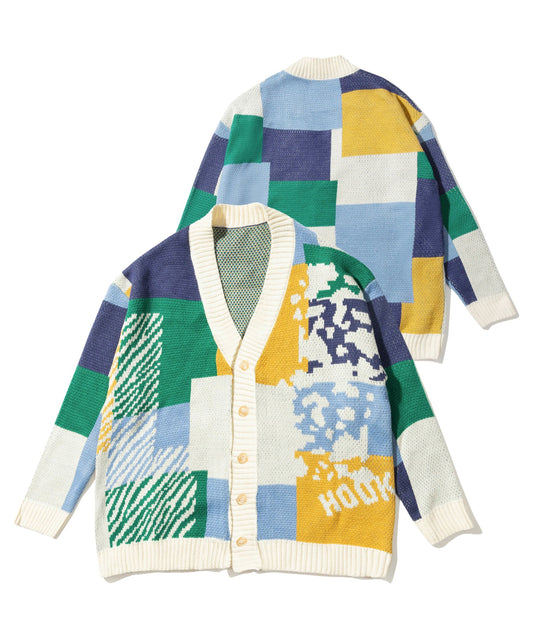 【HOOK -original- 】レトロ調アニマル・配色パッチワークニットカーディガン