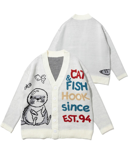 【HOOK -original-】 激かわ「CAT&FISH」英字刺繍猫イラストカーディガン
