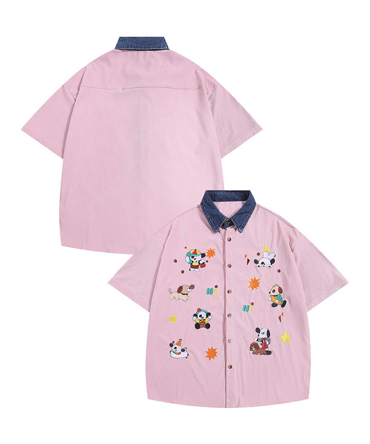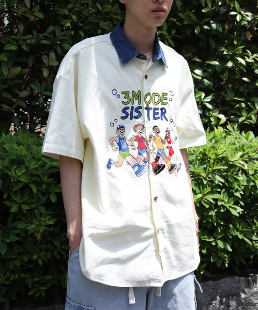 【HOOK -select- 】レトロ調キャラ刺繍夏コーデュロイ半袖シャツ