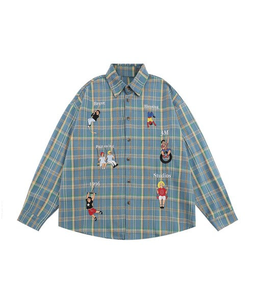 【HOOK】レトロ調人物刺繍チェック柄長袖シャツ