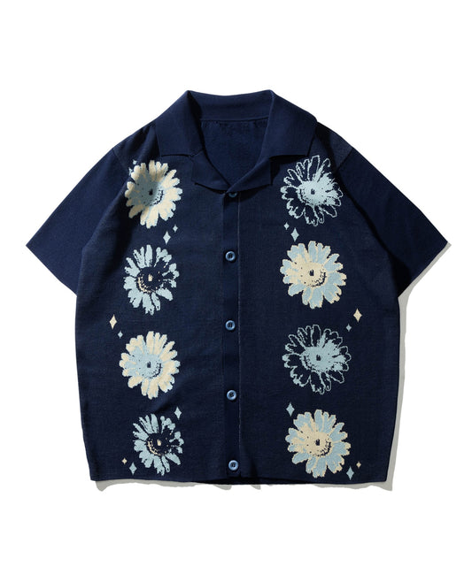 【HOOK -original-】 ポップマーガレット模様アロハシャツ風涼感夏ニット