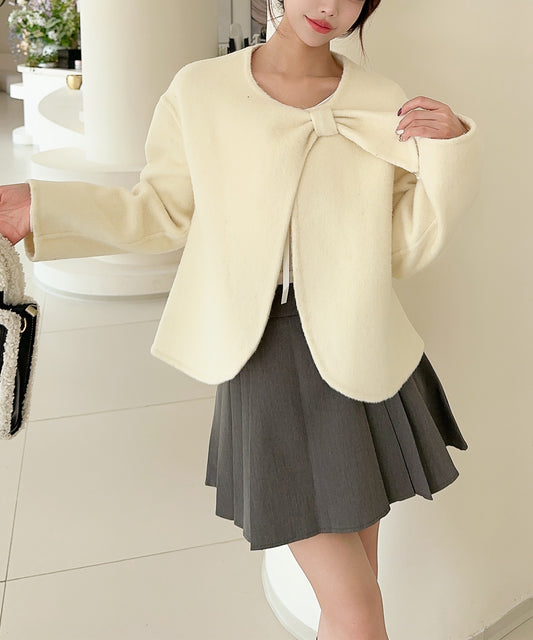 【Jasmine】リボンノーカラーリバーウールコート ショート丈