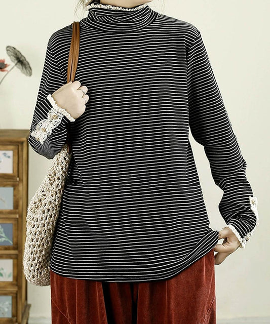 ボーダーデザインフリルタートルネックトップス
