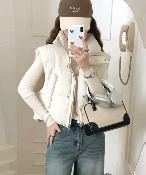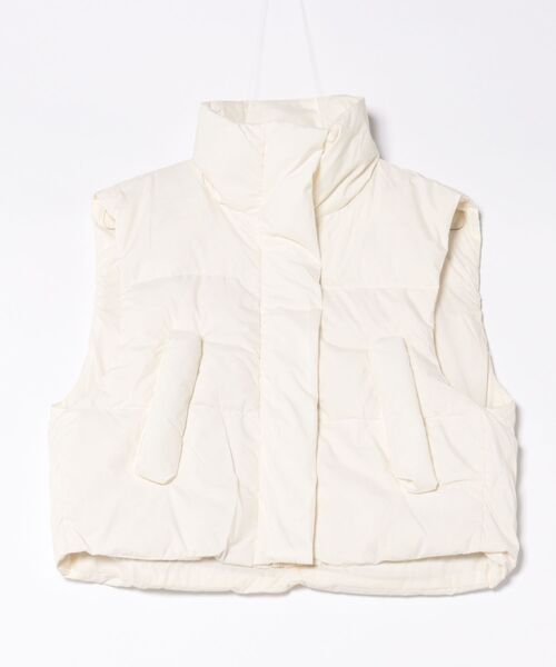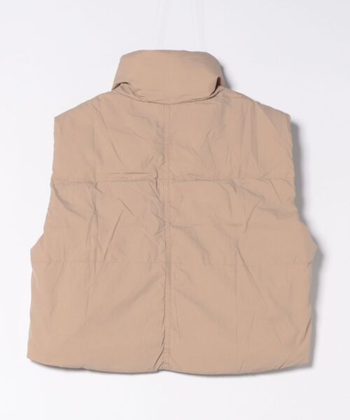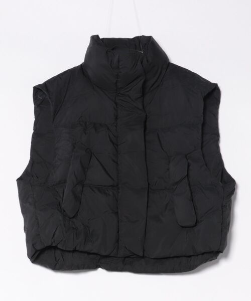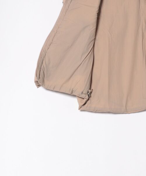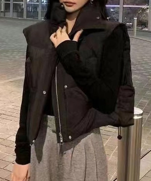 肩部分がないベスト仕様なので、中にニットやスウェット、フーディなどを重ねやすく、気温に合わせたレイヤードが可能。