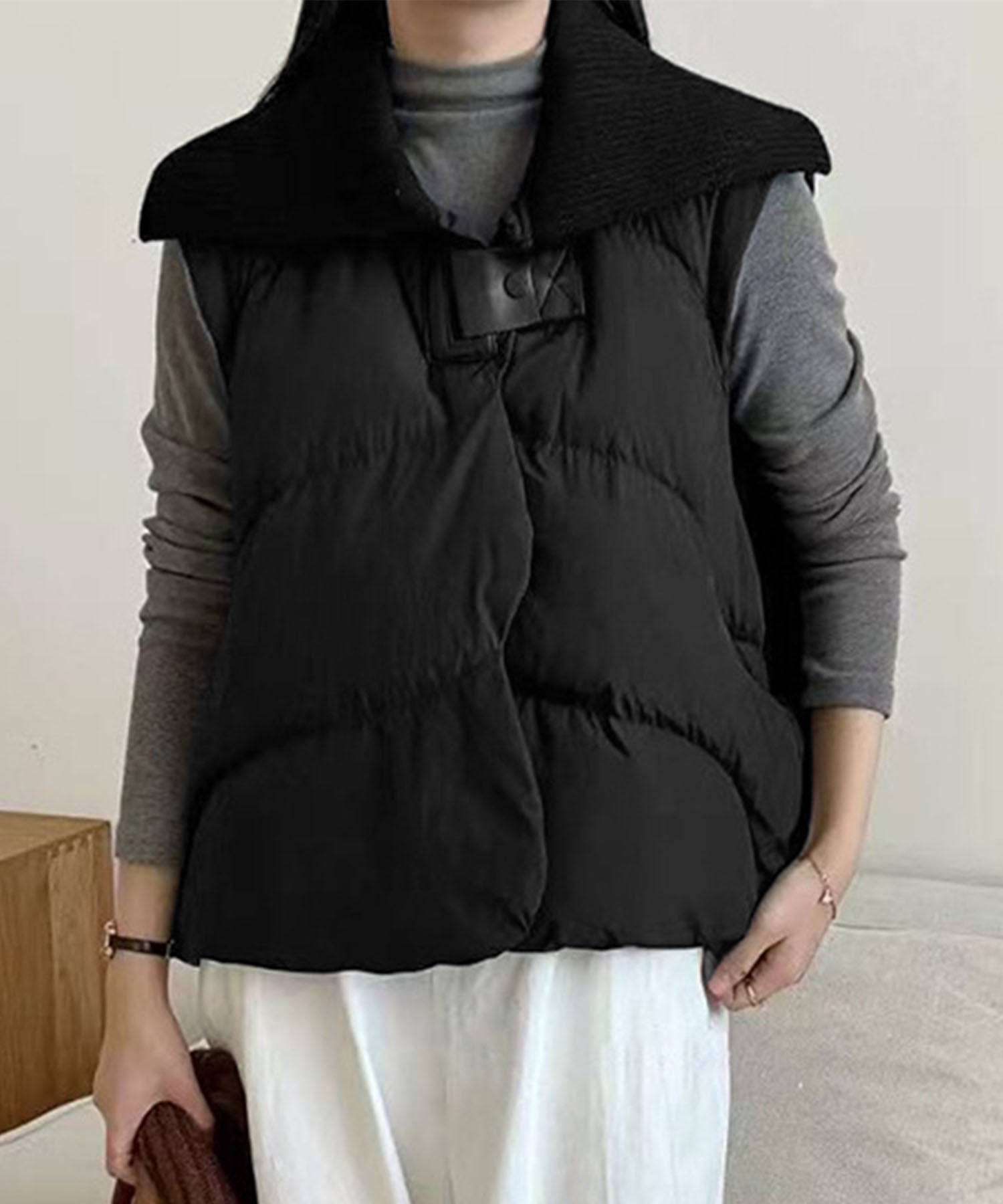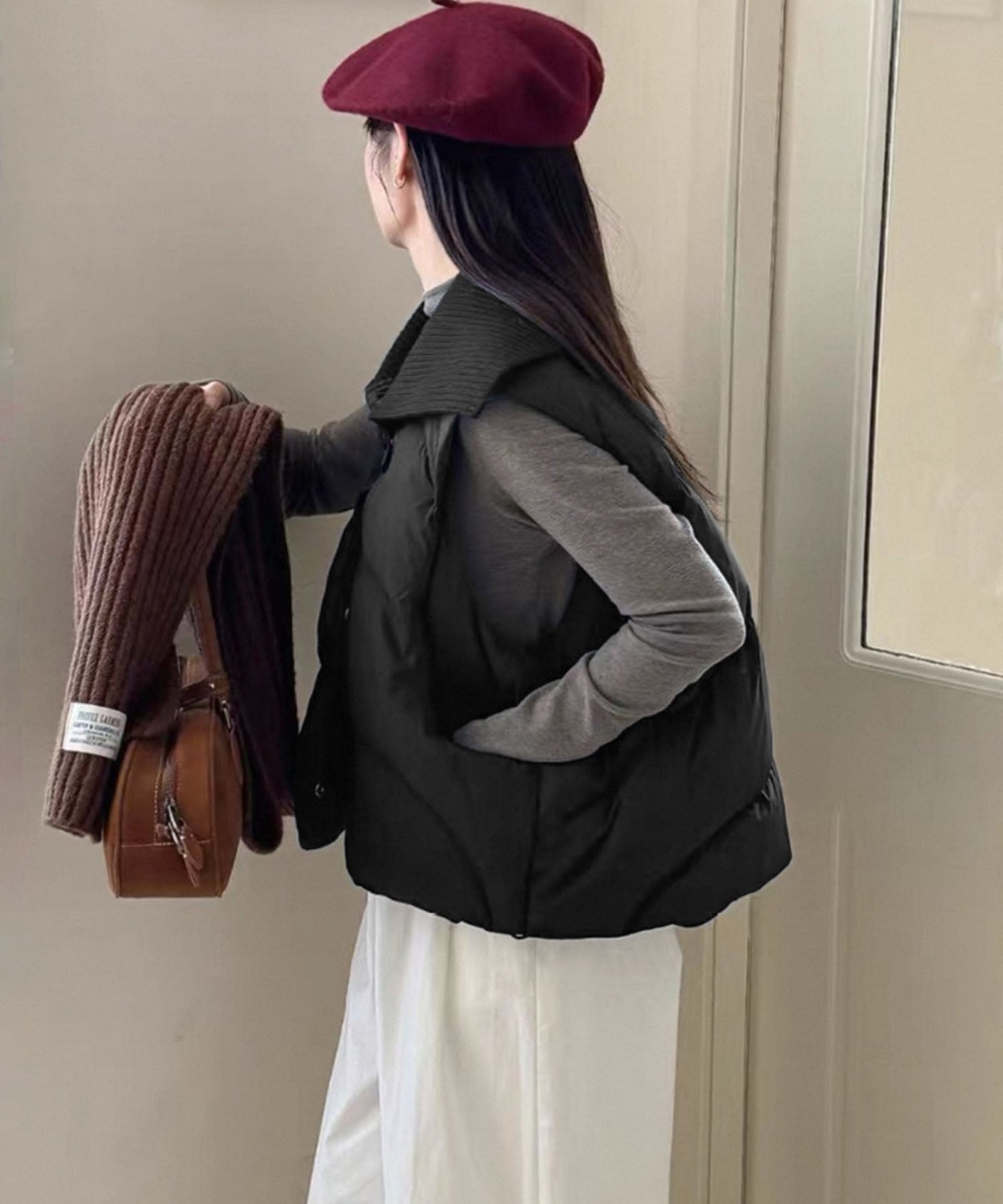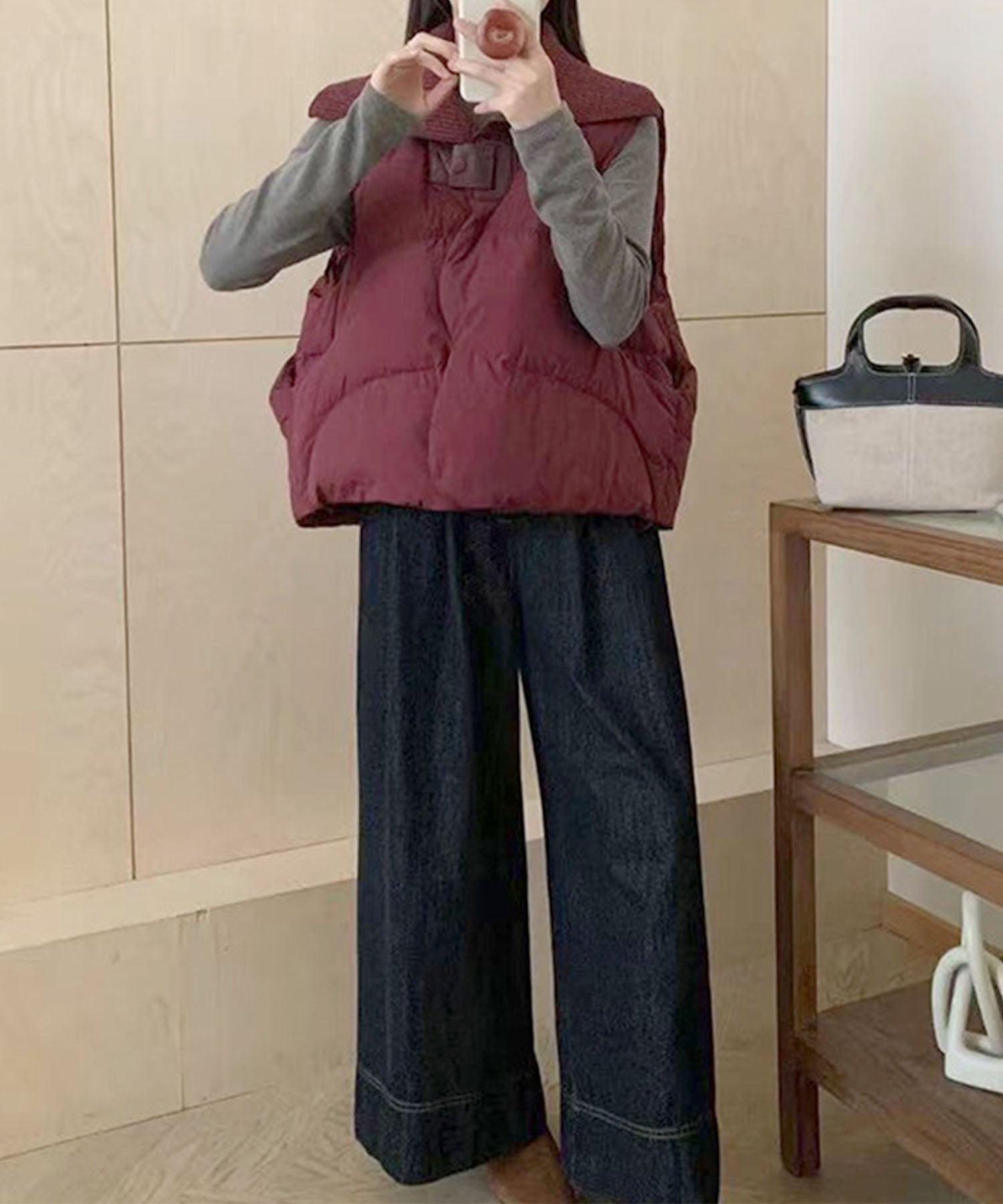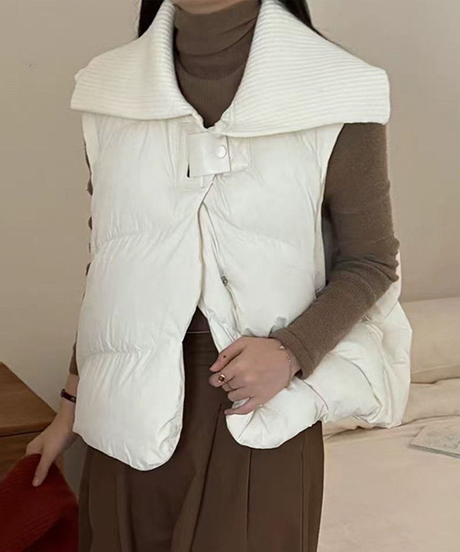首元に立体的なニット衿をあしらったショート丈ダウンベスト。