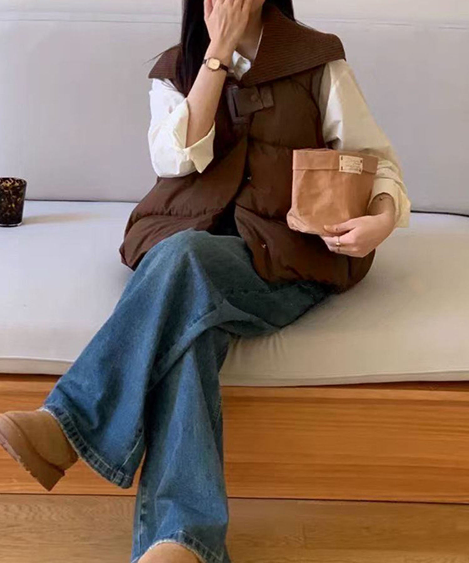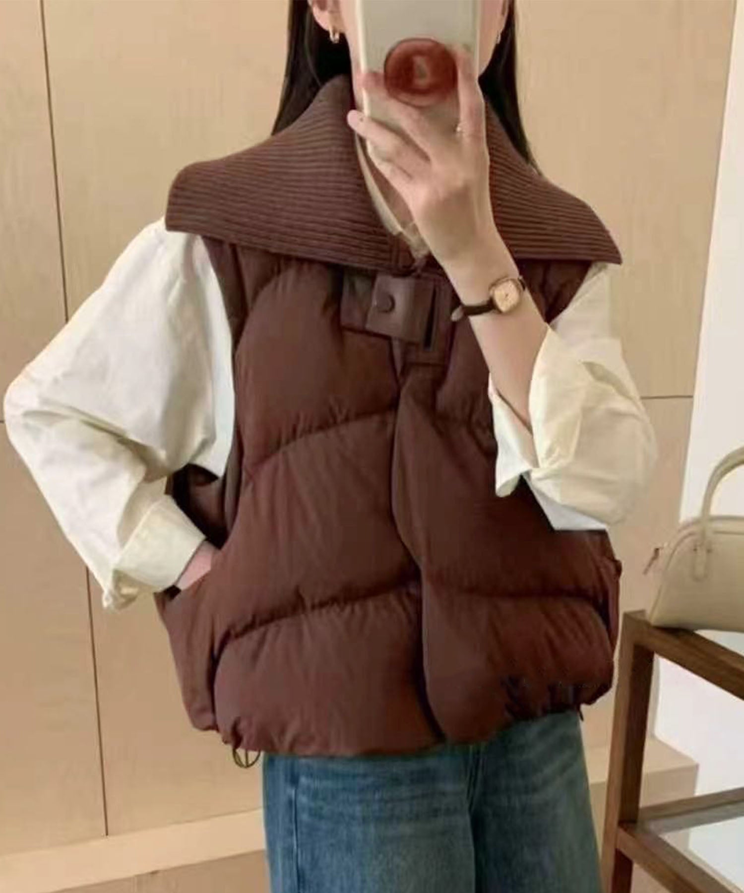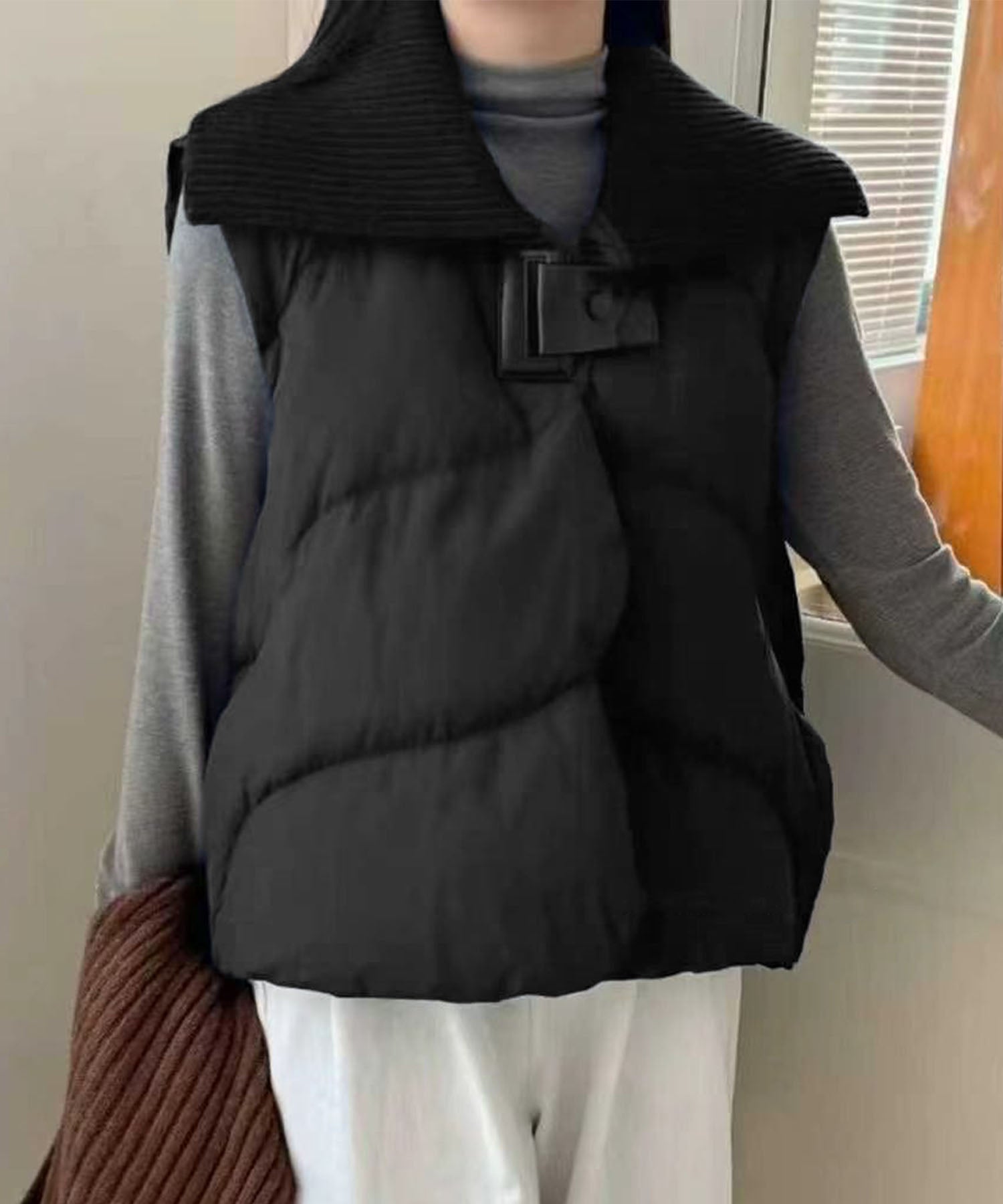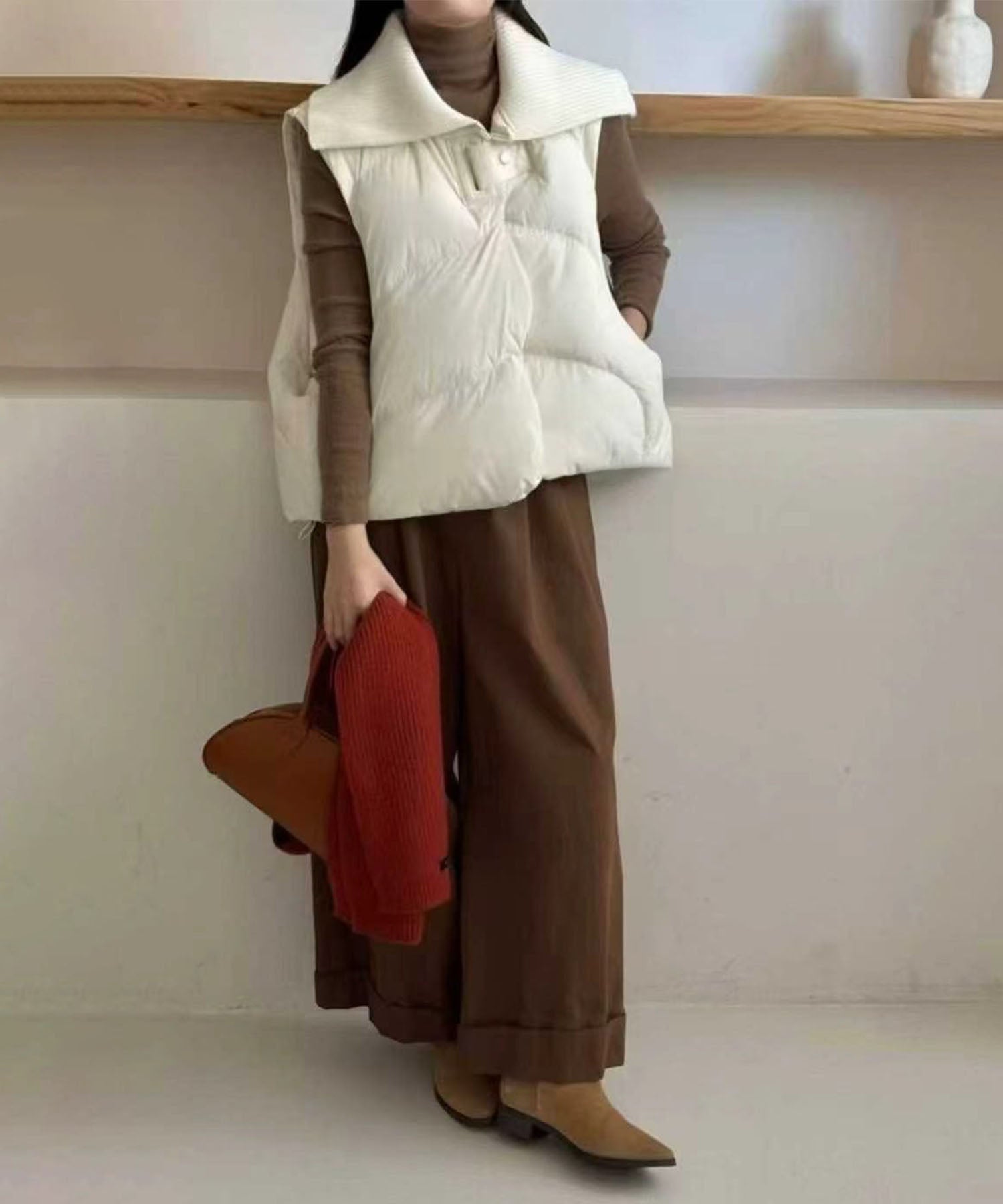 首元に立体的なニット衿をあしらったショート丈ダウンベスト。