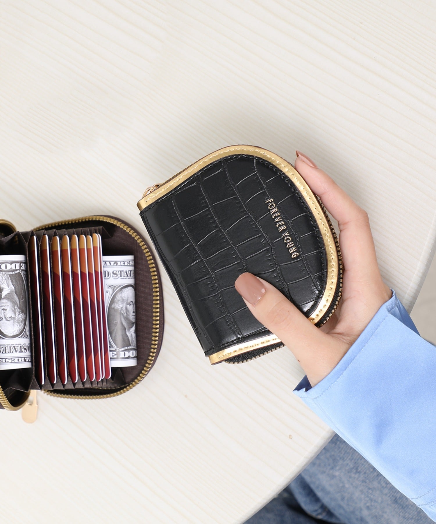 現金も少し持ち歩きたい人用にサイドは少し広めになっているので小物の収納もしていただけます。