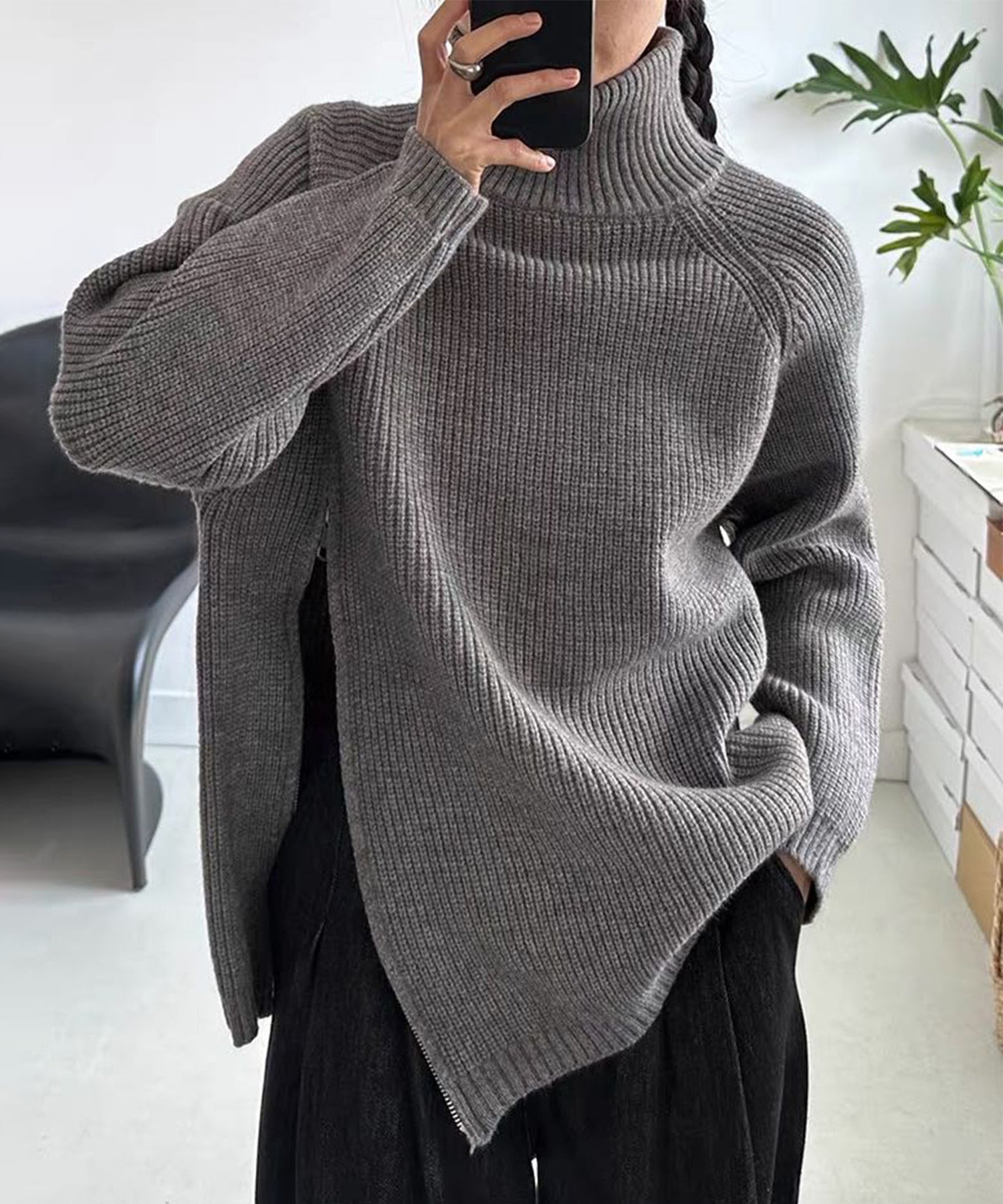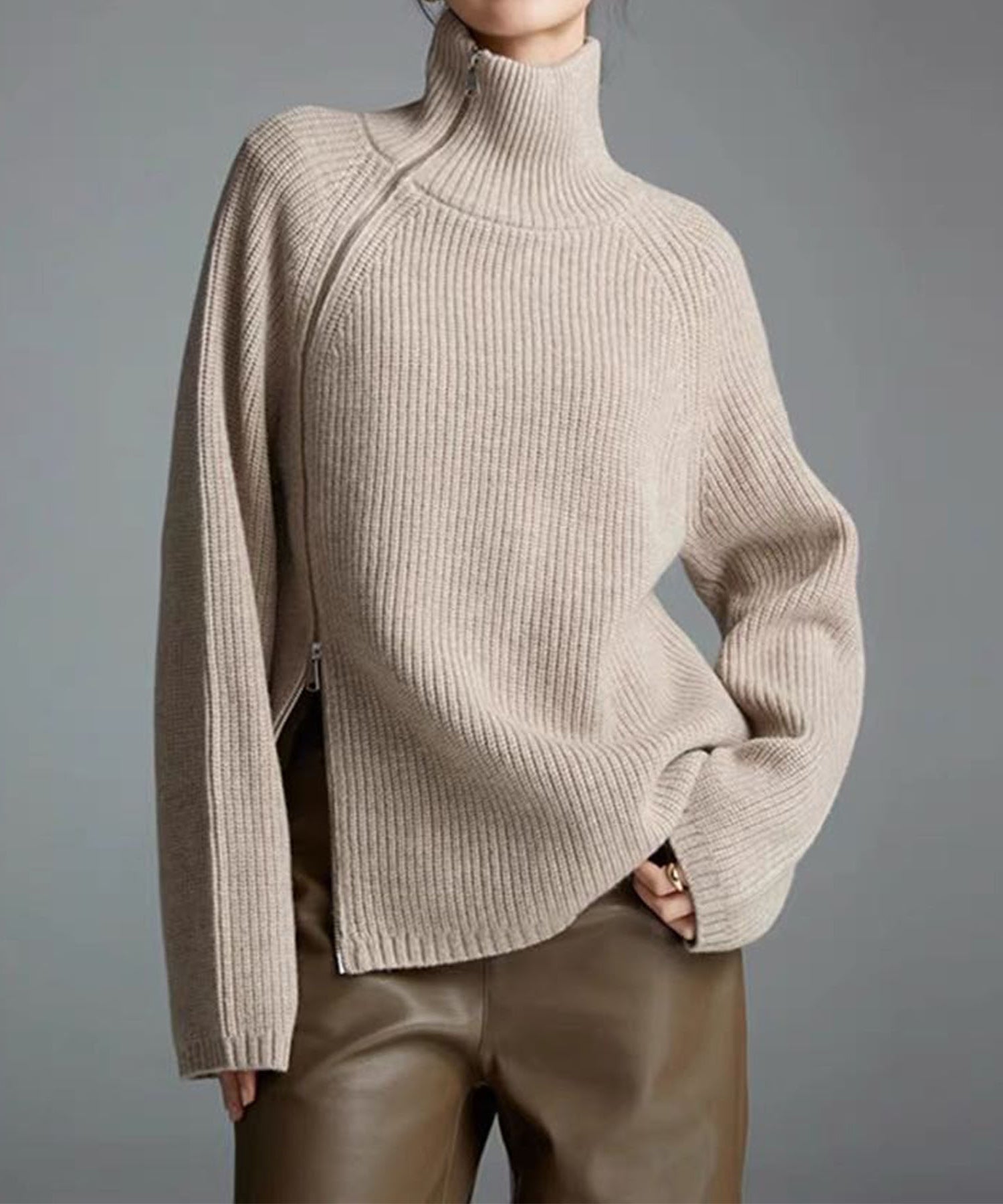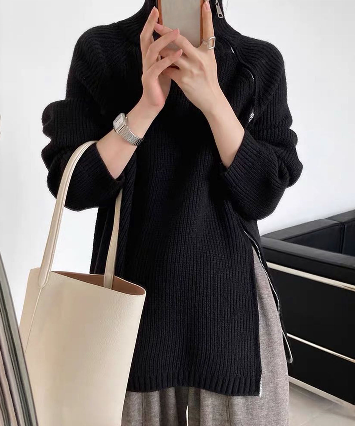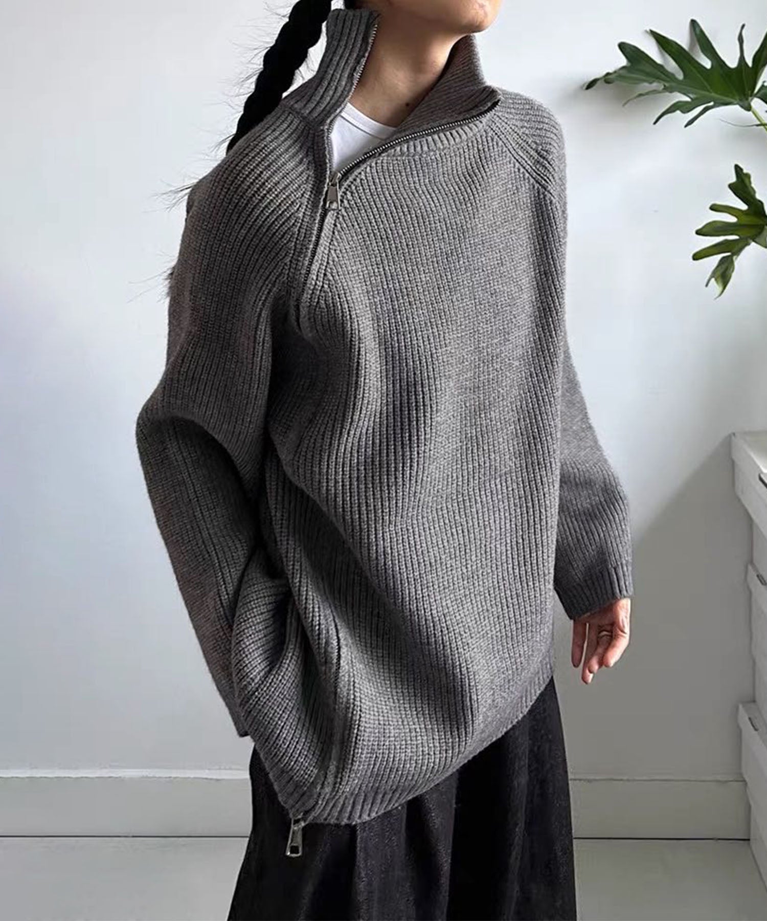 斜めに走るファスナーが目を引く、ユニークなデザインのニットトップス。アシンメトリーなシルエットが動きを生み出し、シンプルながらも存在感のあるスタイルに仕上げてくれます。