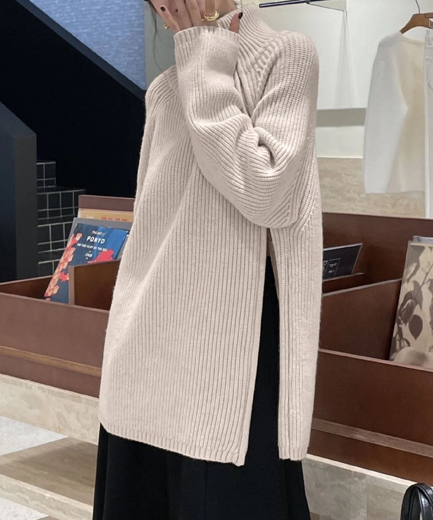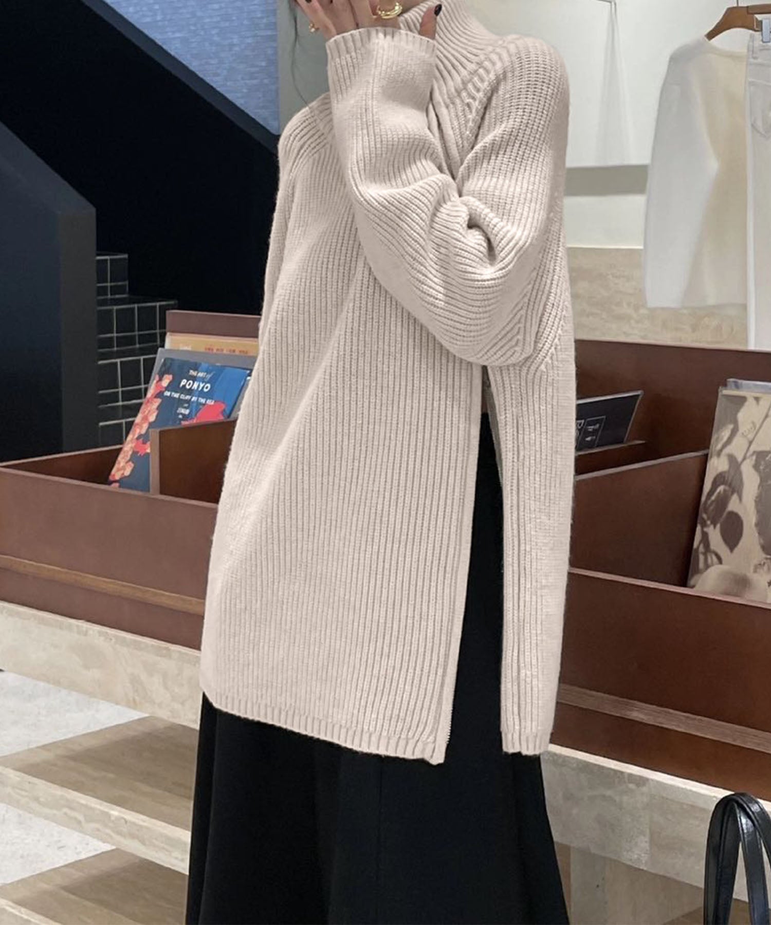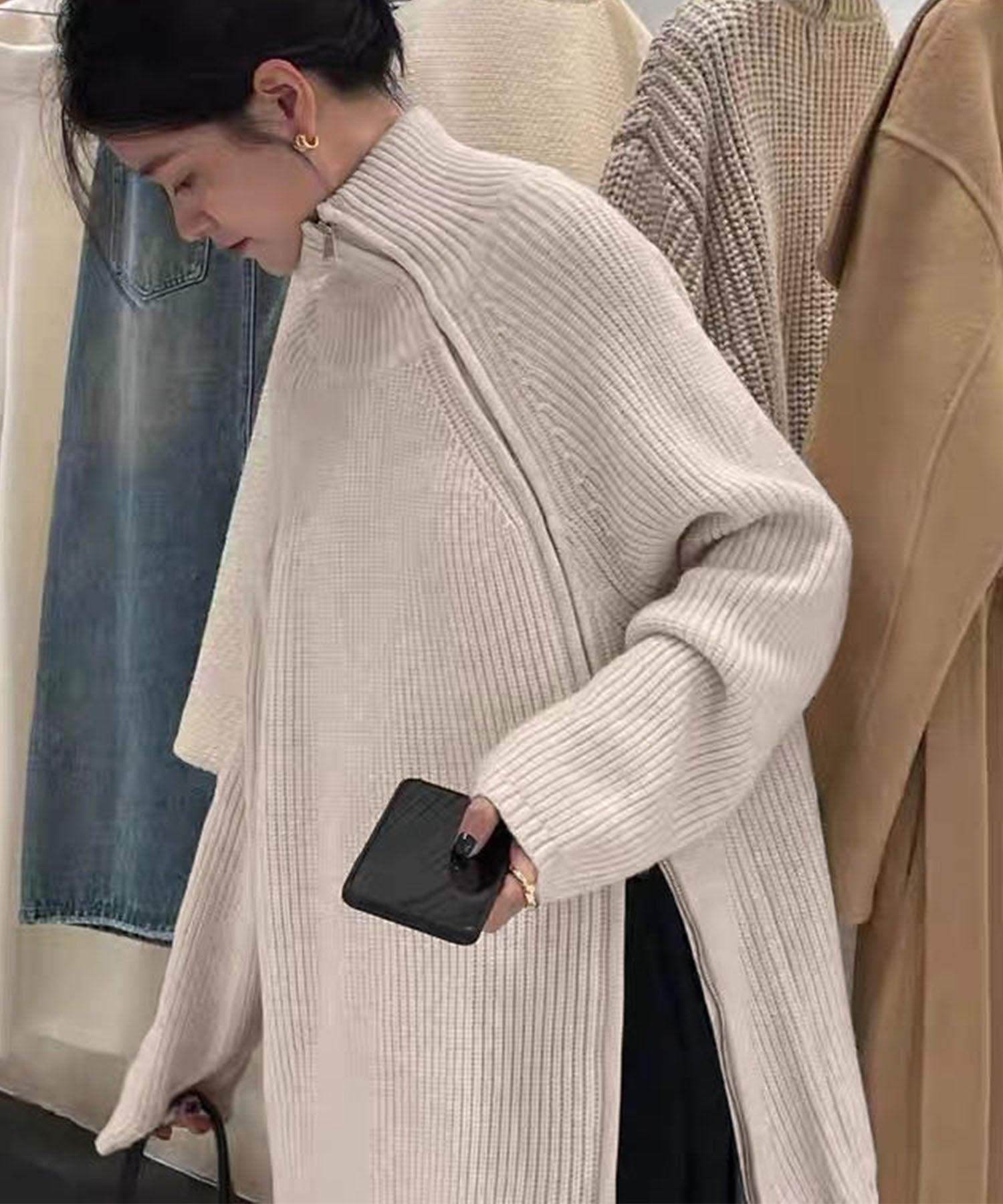 ロングスカートと合わせてジップを閉じれば、落ち着いた女性らしいスタイルにもマッチ。