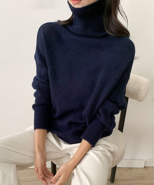 上品でシンプルなデザインのタートルネックニットプルオーバー。