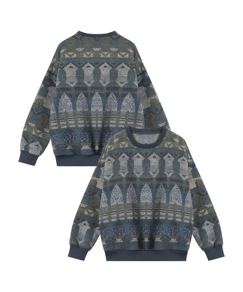 どこか懐かしくて温かみのある、レトロ調の民族模様ジャカードセーター。