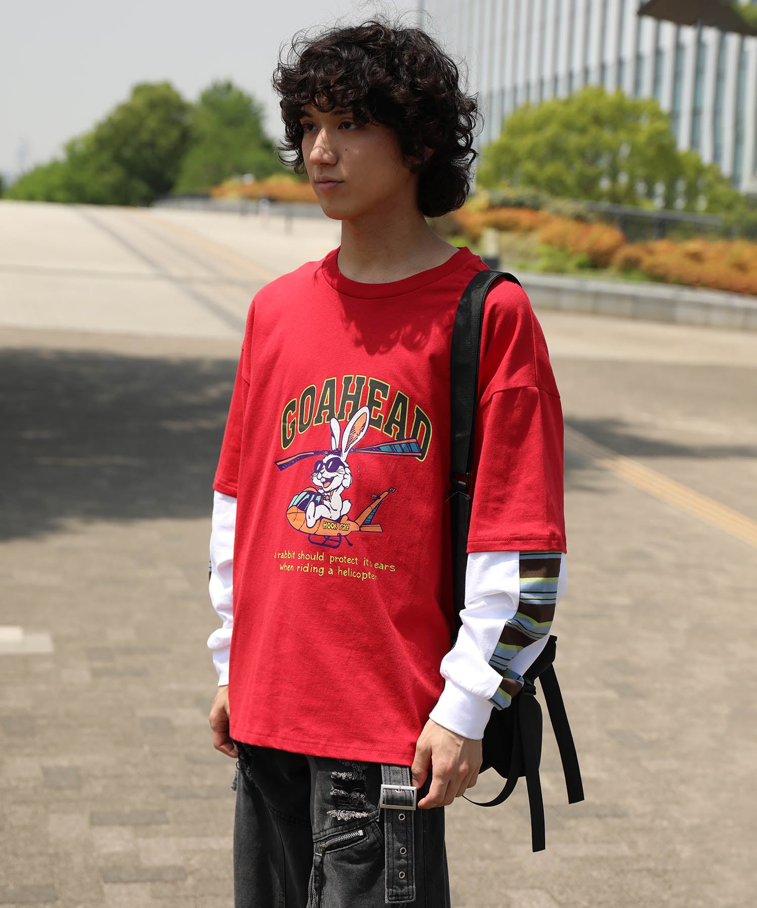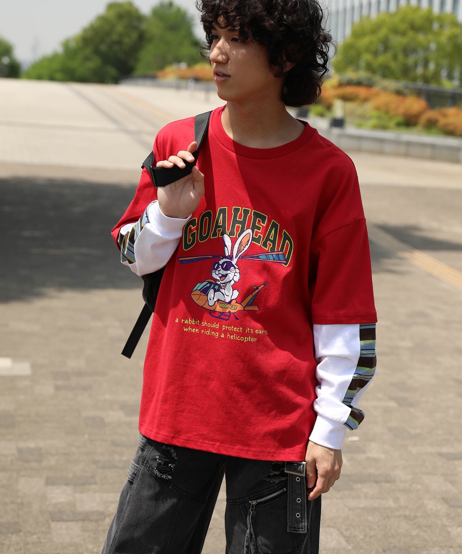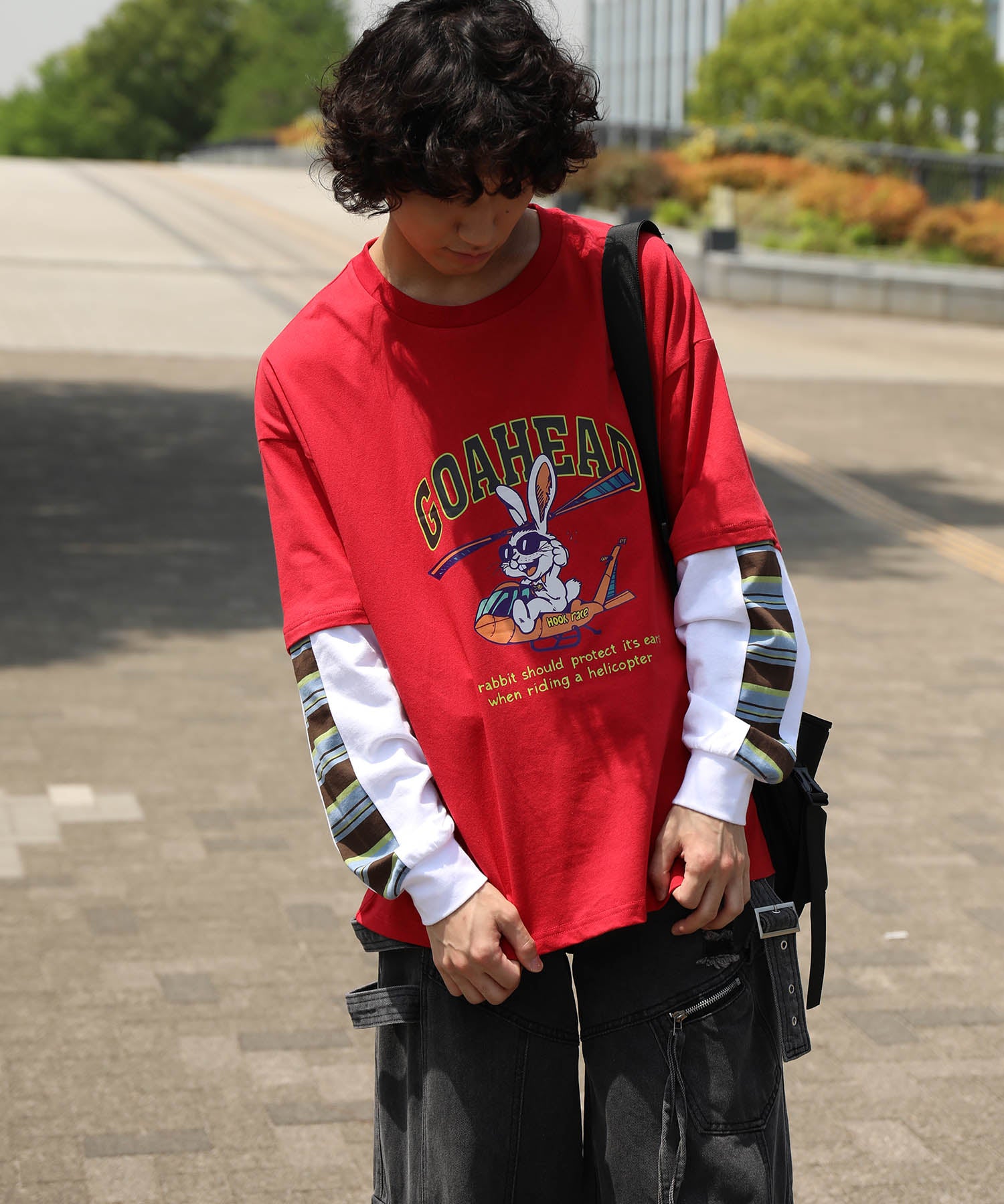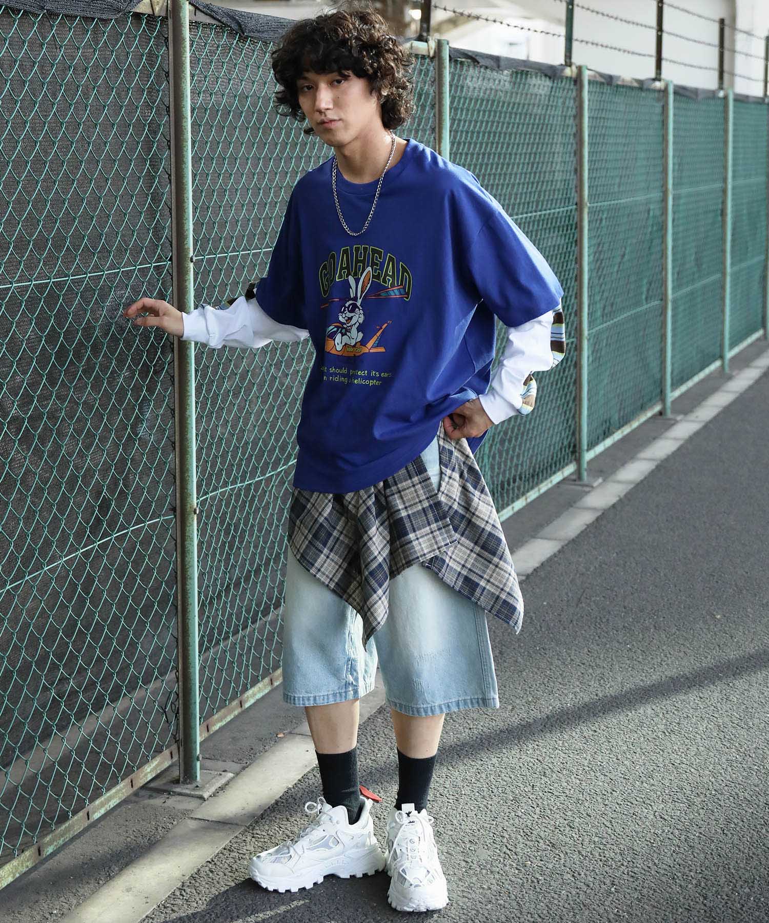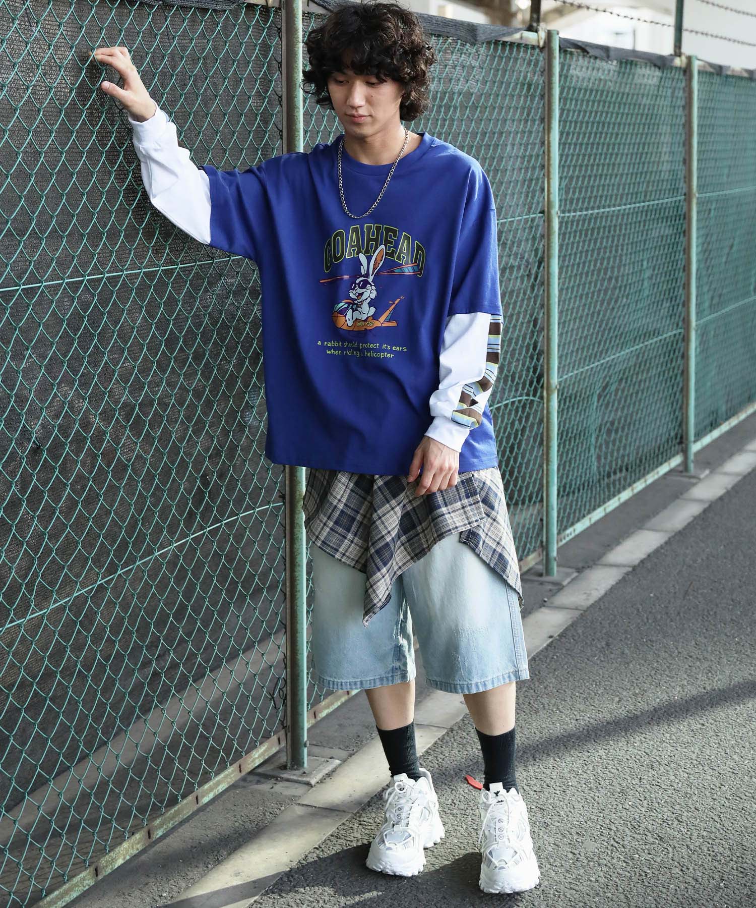 フロントにはアメリカンカートゥーン風の飛行機に乗るワイルドなうさぎをプリント。キャッチーなグラフィックと、ストリート感のある英字デザインが特徴的な一枚です。さらに、袖の切り替え部分から袖口にかけてマルチボーダーのラインが入ったデザインになっており、レイヤード風のユニークなスタイルを演出。