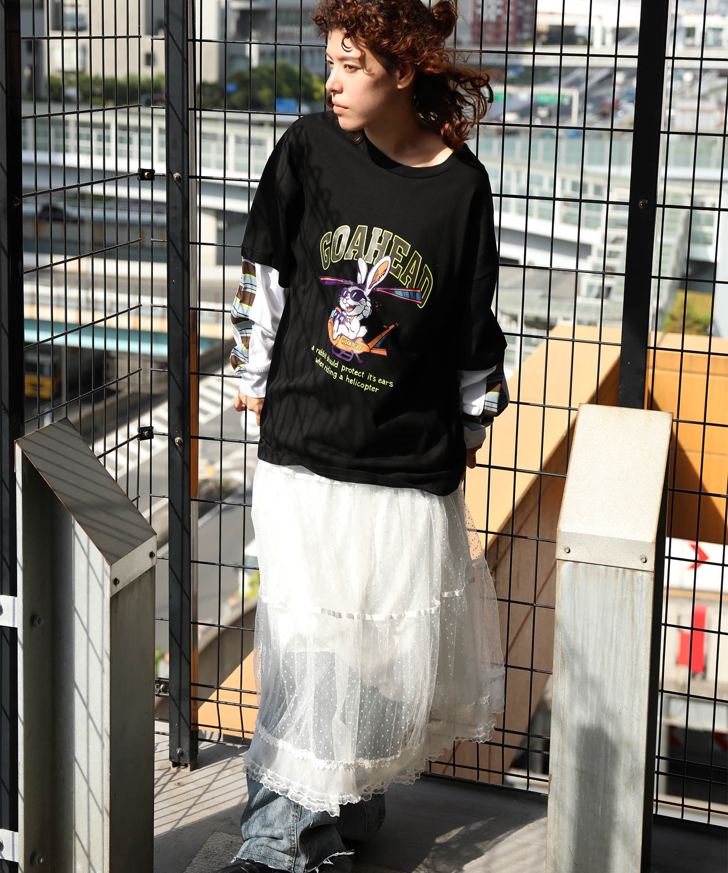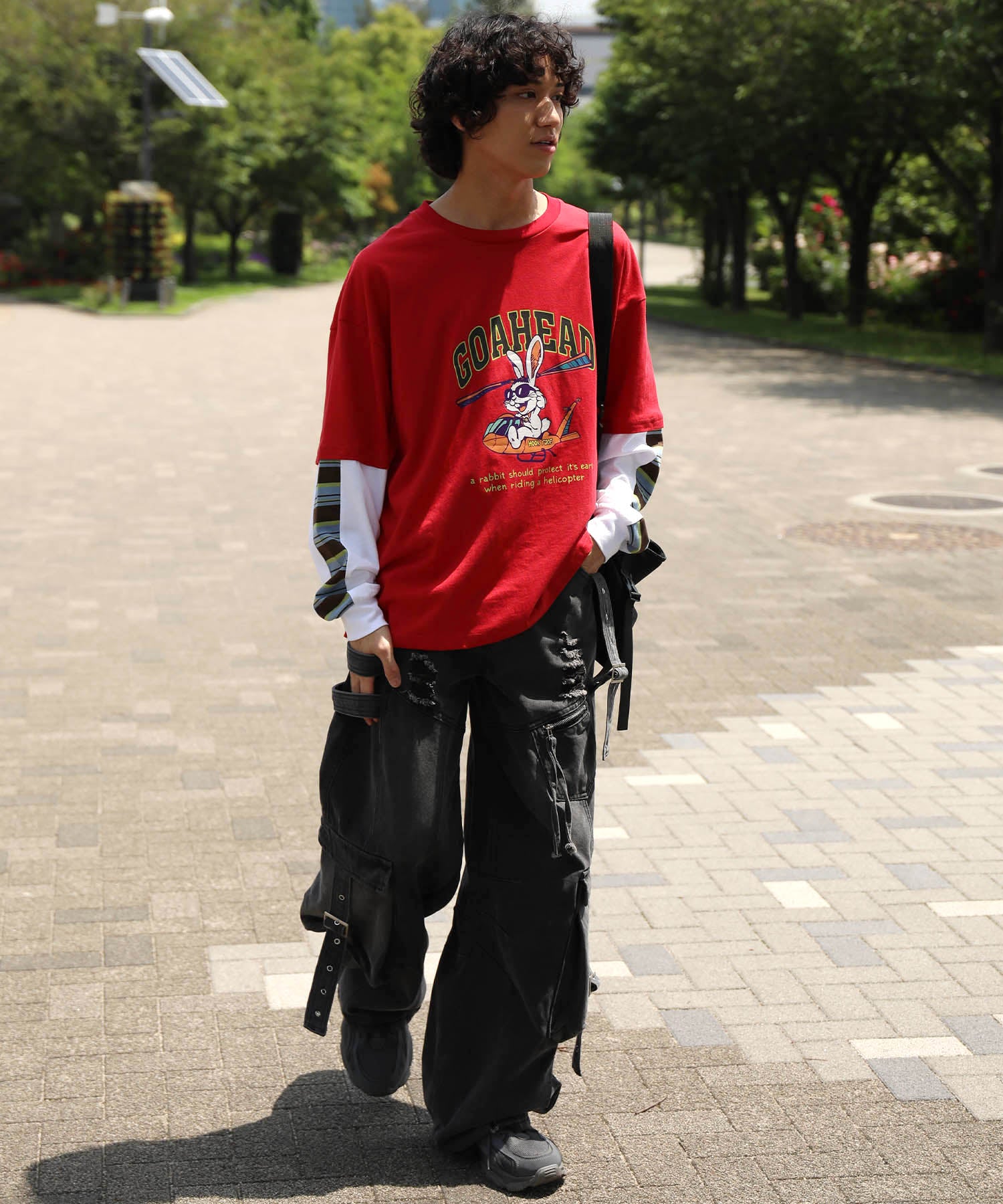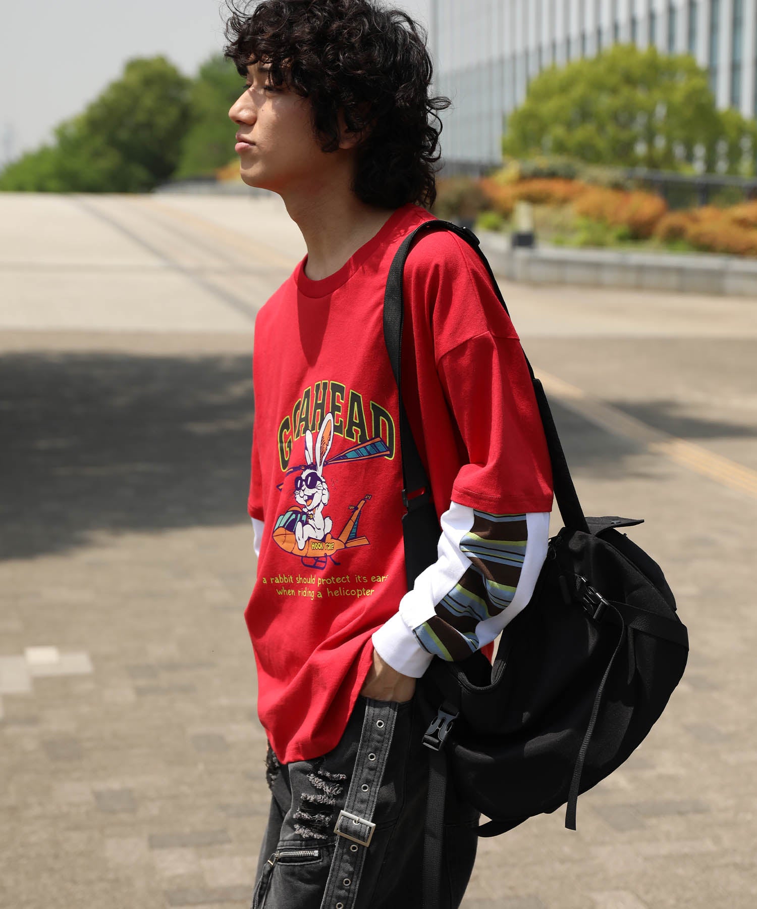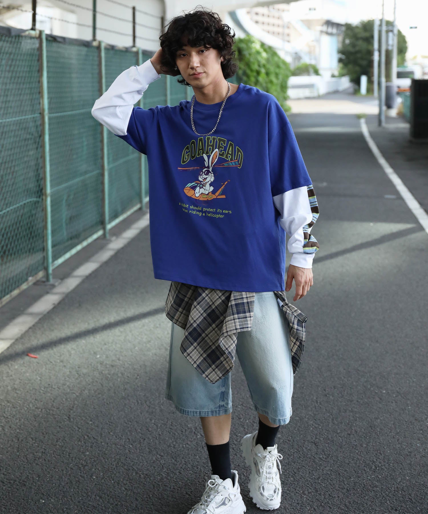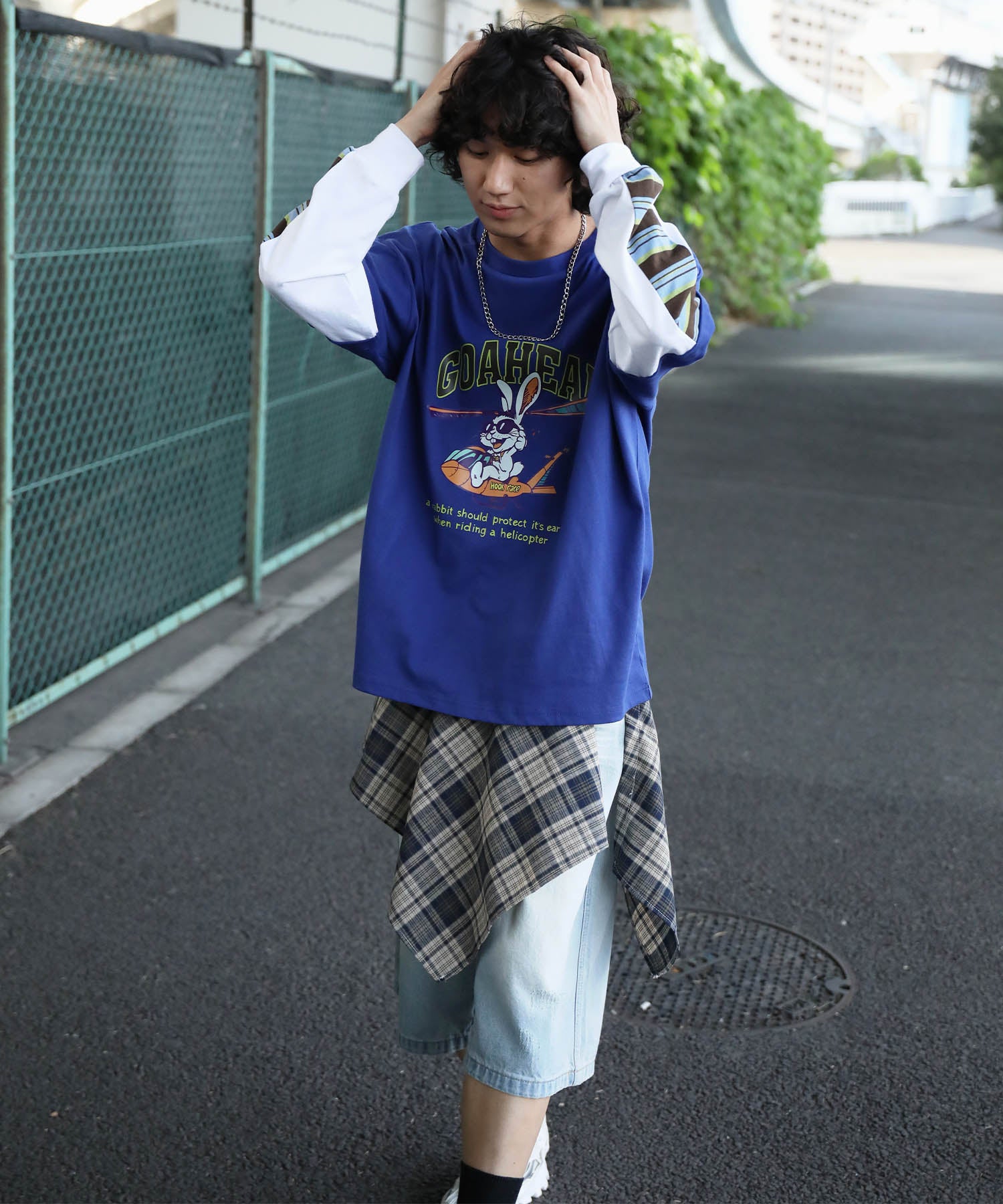 フロントにはアメリカンカートゥーン風の飛行機に乗るワイルドなうさぎをプリント。キャッチーなグラフィックと、ストリート感のある英字デザインが特徴的な一枚です。さらに、袖の切り替え部分から袖口にかけてマルチボーダーのラインが入ったデザインになっており、レイヤード風のユニークなスタイルを演出。