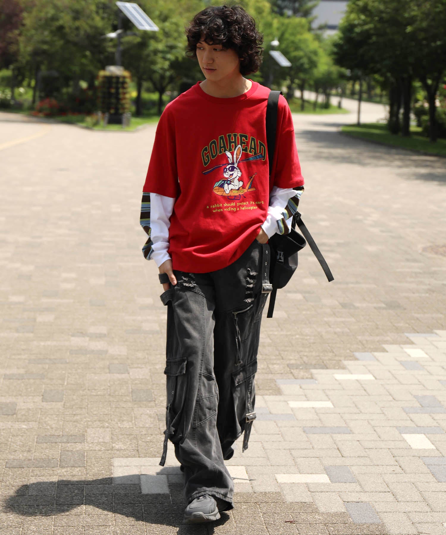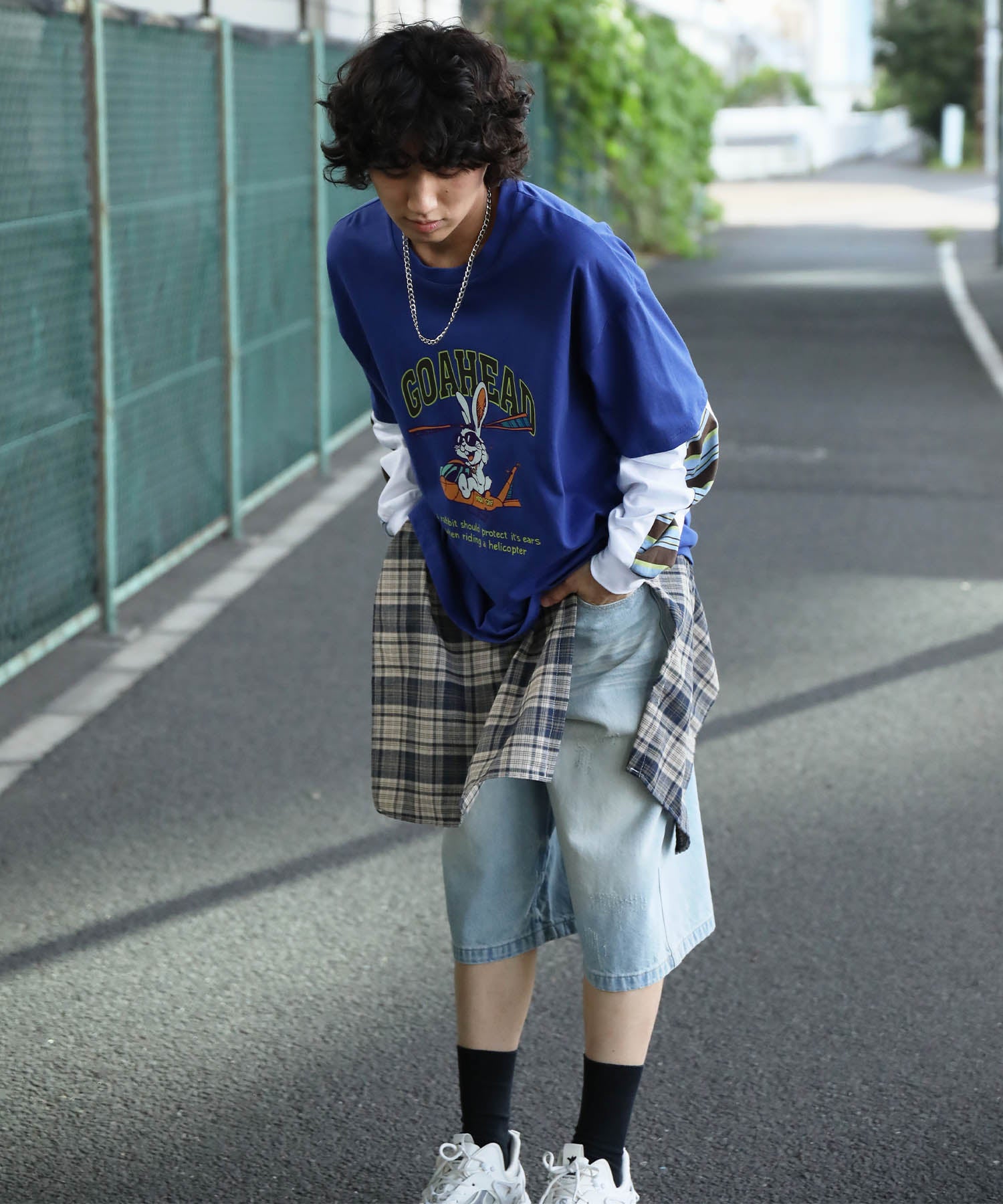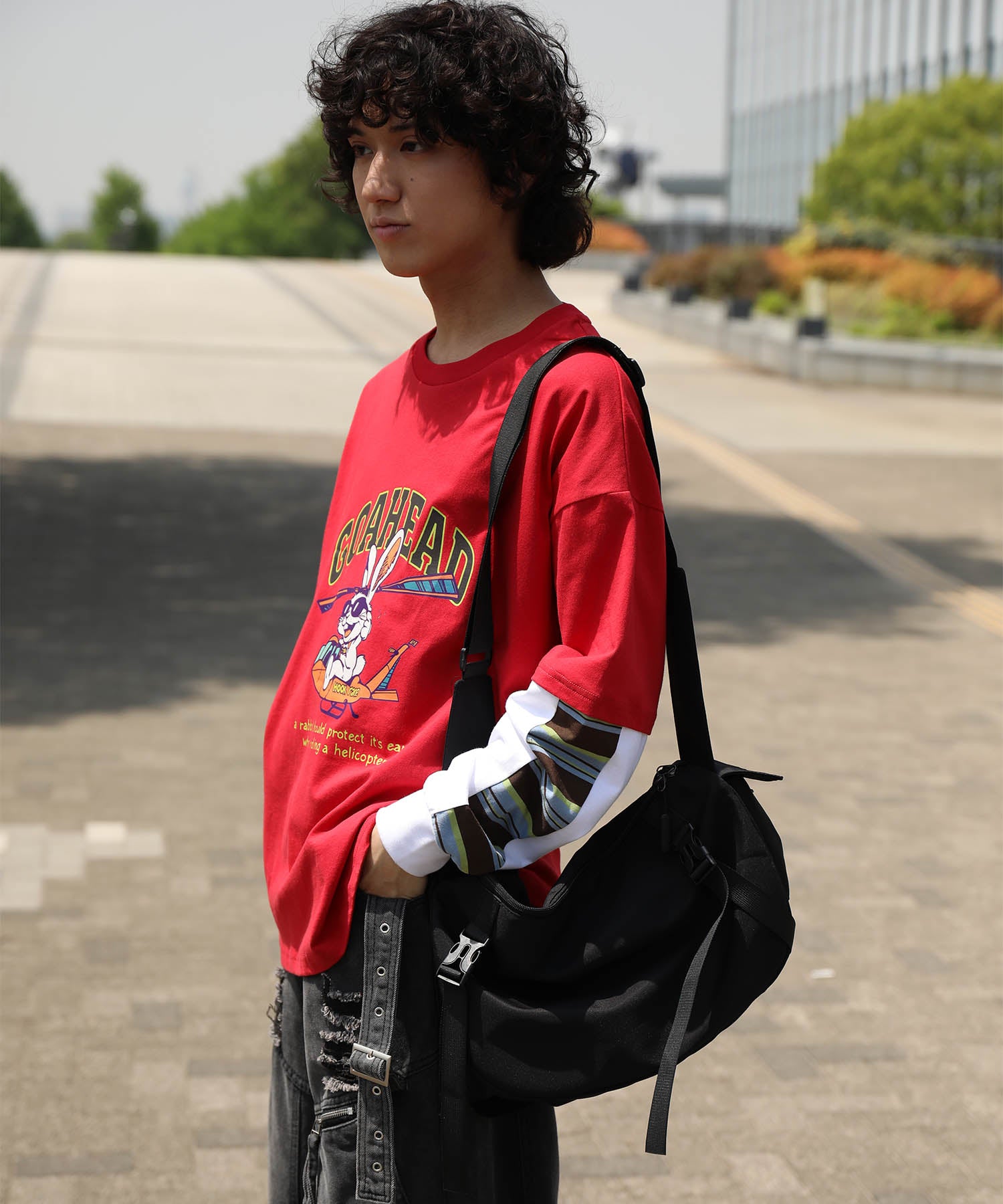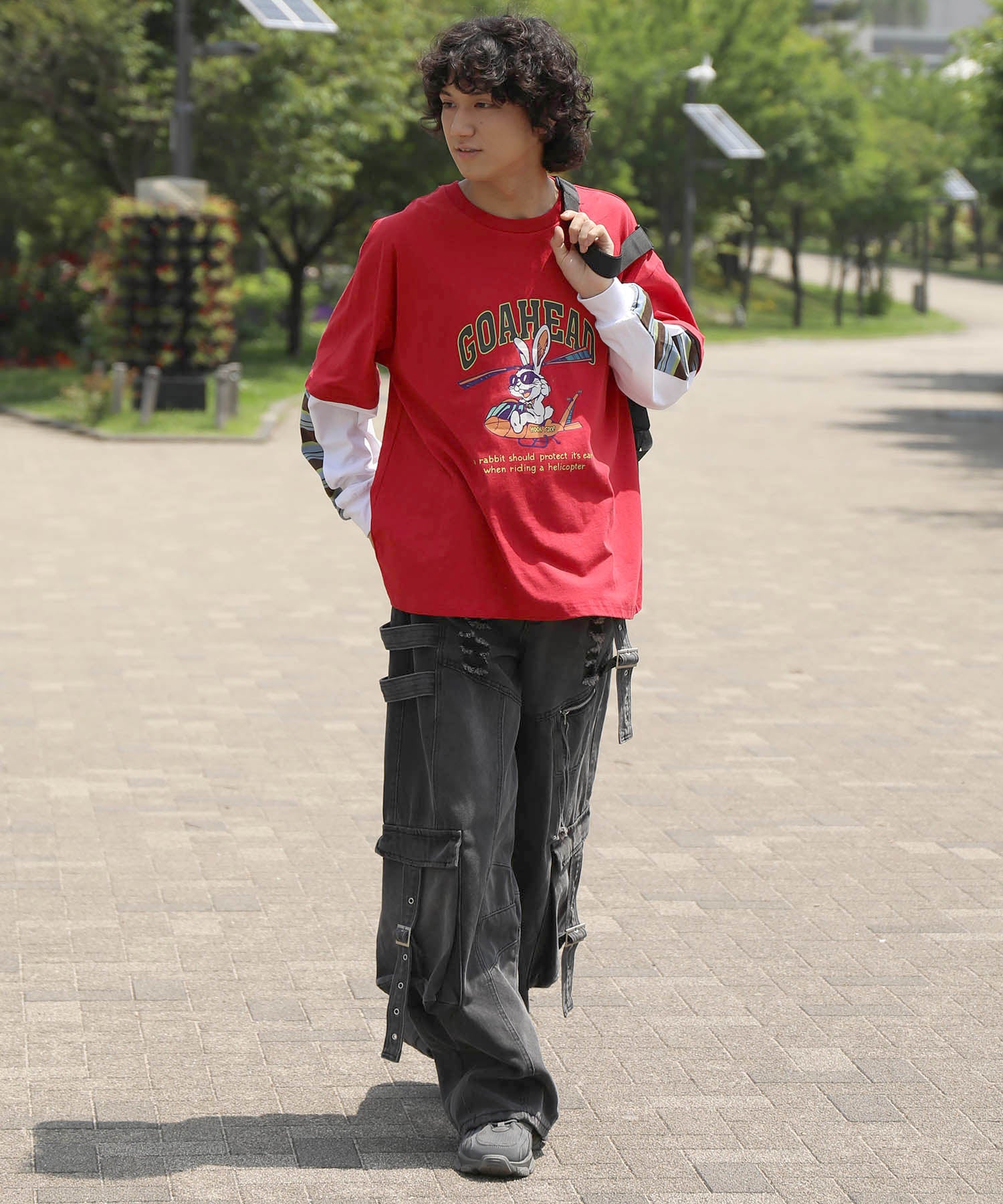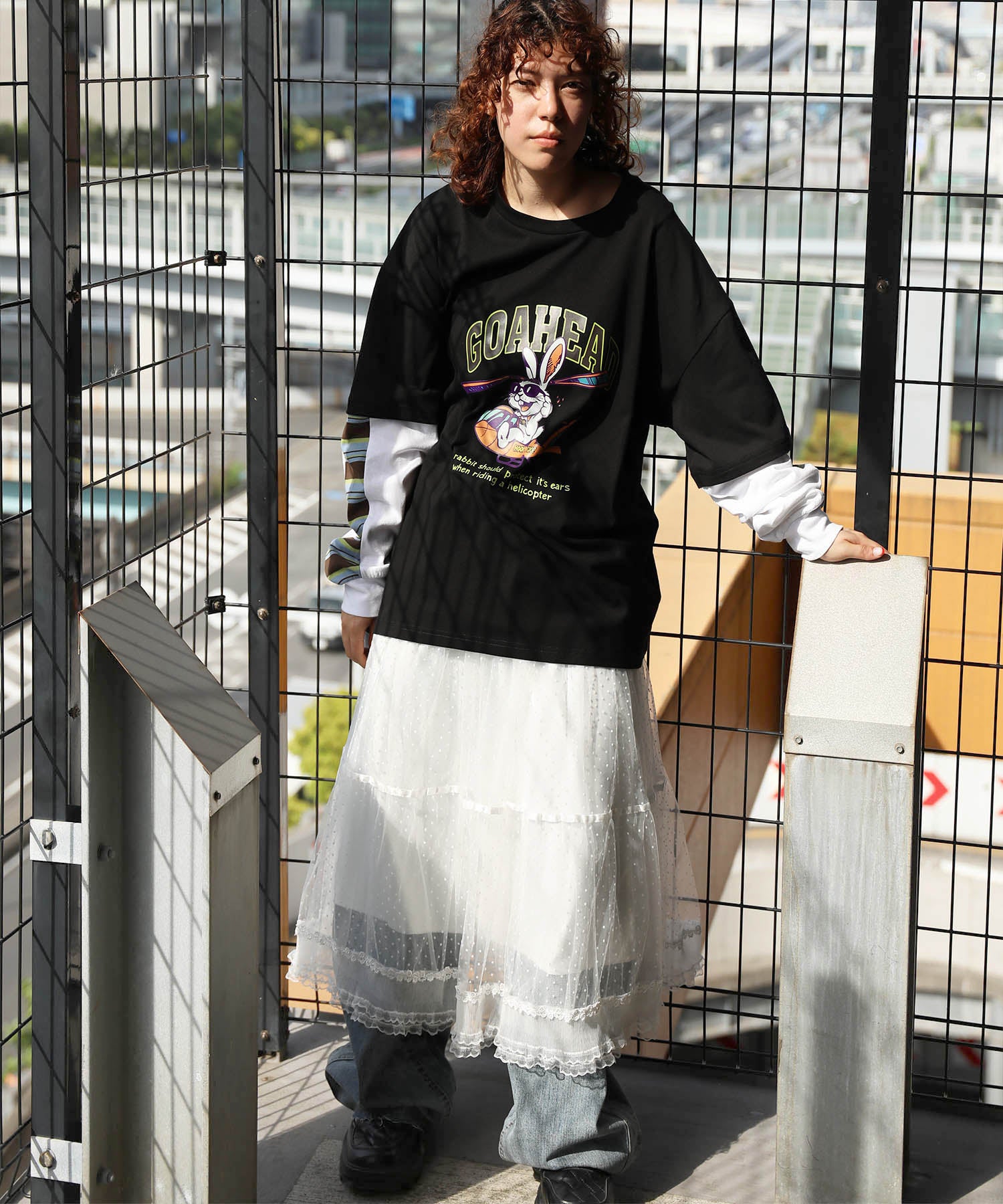 フロントにはアメリカンカートゥーン風の飛行機に乗るワイルドなうさぎをプリント。キャッチーなグラフィックと、ストリート感のある英字デザインが特徴的な一枚です。さらに、袖の切り替え部分から袖口にかけてマルチボーダーのラインが入ったデザインになっており、レイヤード風のユニークなスタイルを演出。