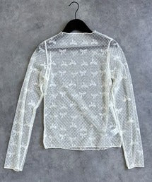 トレンドのシアー素材に、可愛らしいリボンとダイヤチェックの接点にドットをあしらった柄がアクセントになった一着。