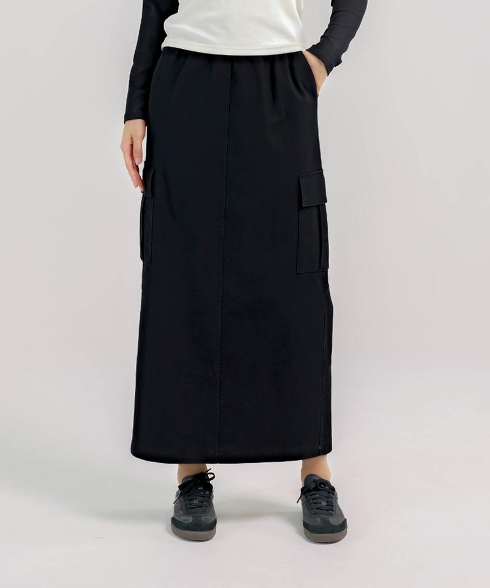 ミニマルなストレートシルエットが特徴のロングスカート。サイドのカーゴポケットがアクセントとなり、実用性とトレンド感をプラスします。ウエストゴム仕様で快適な履き心地でシンプルでありながら個性のあるデザインに仕上がっています。デイリーユースからおしゃれな外出シーンまで幅広く活躍します。