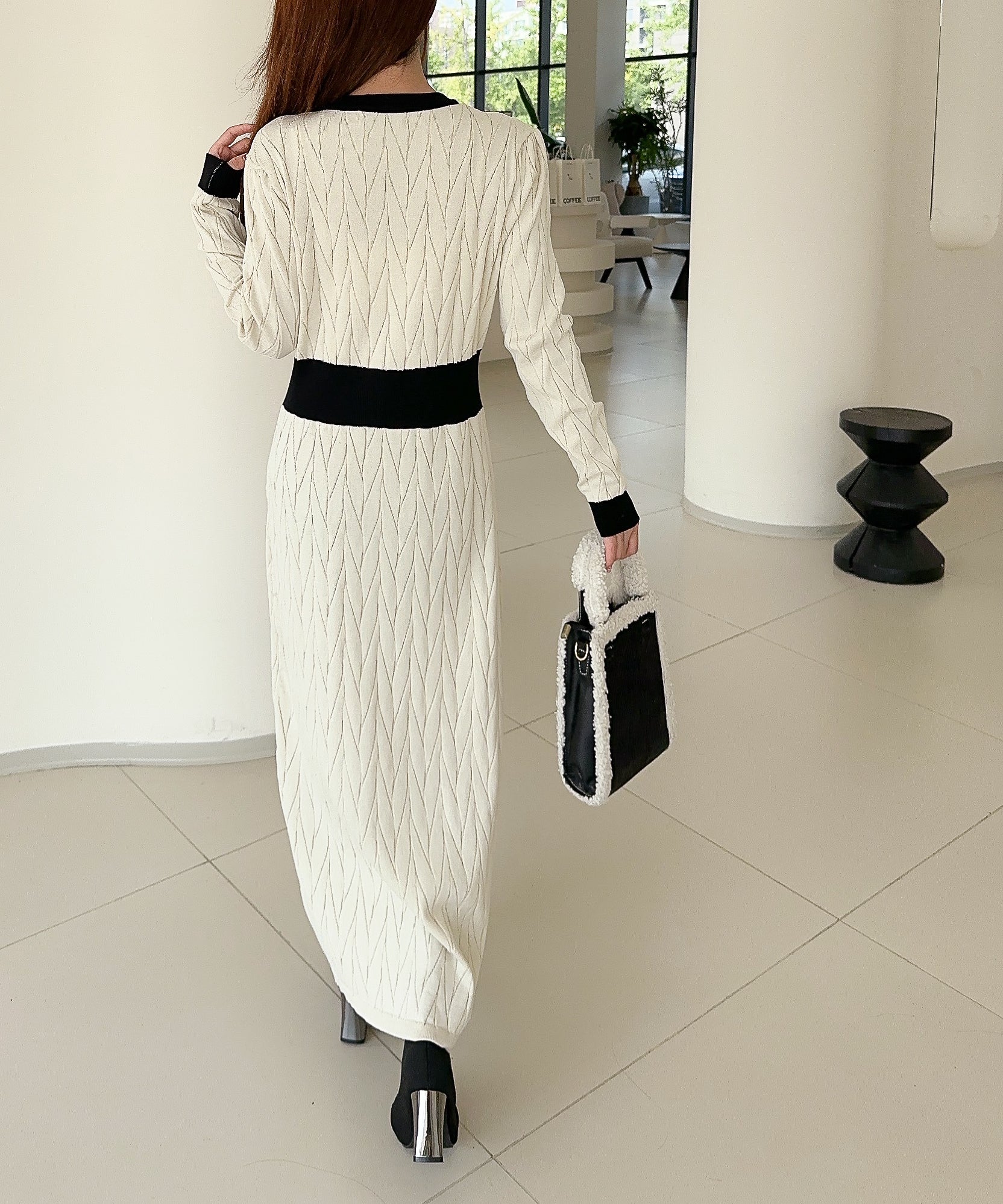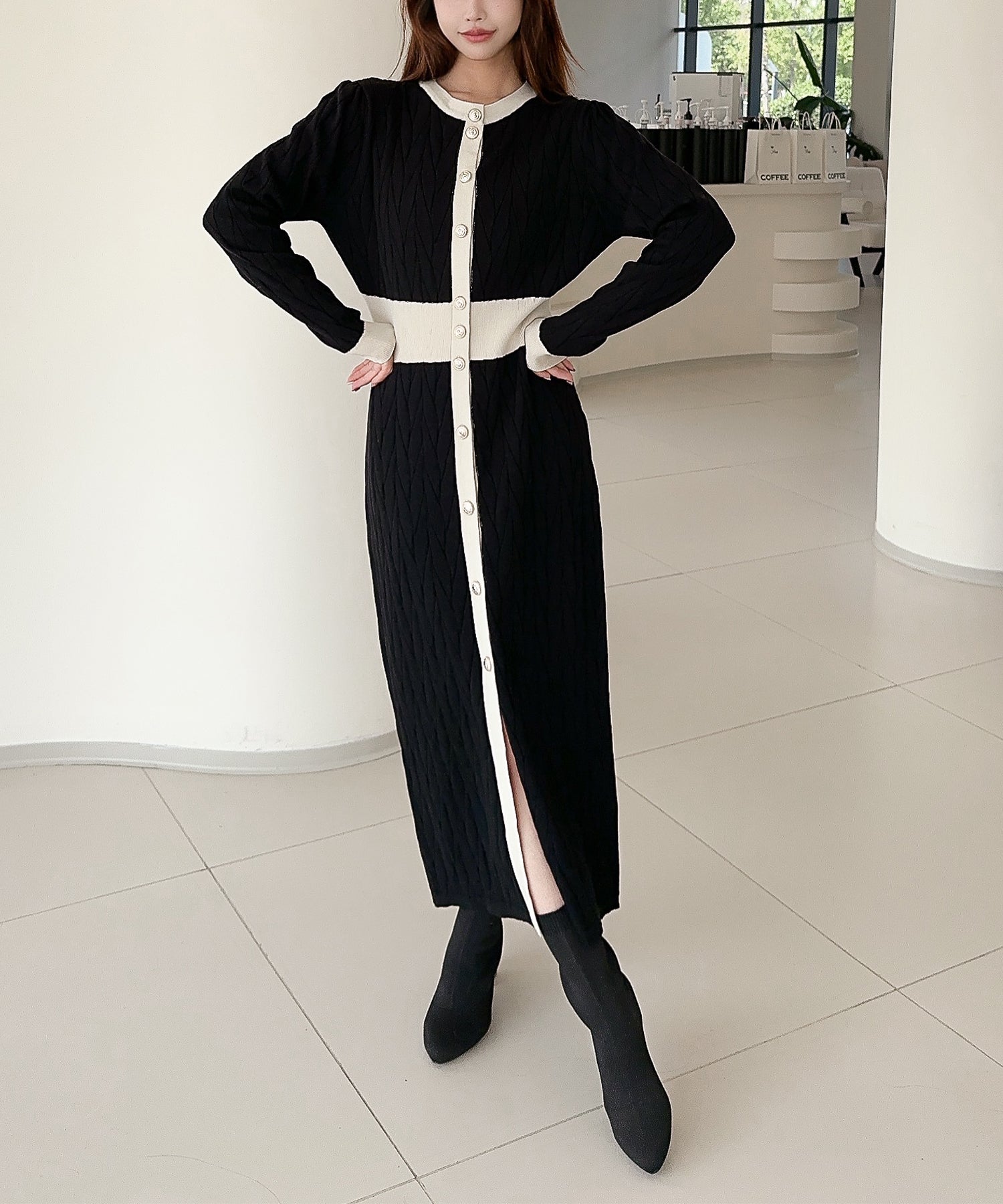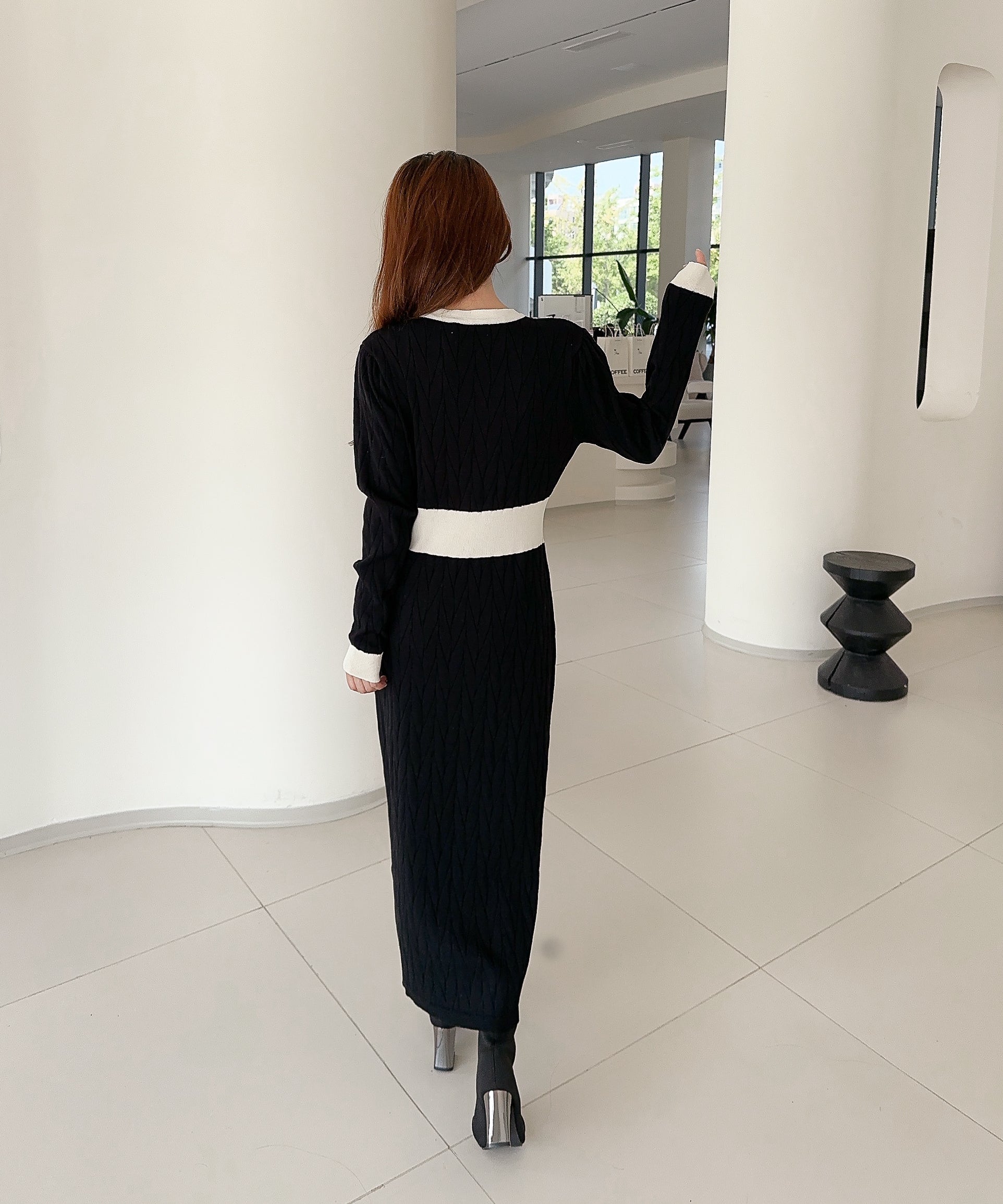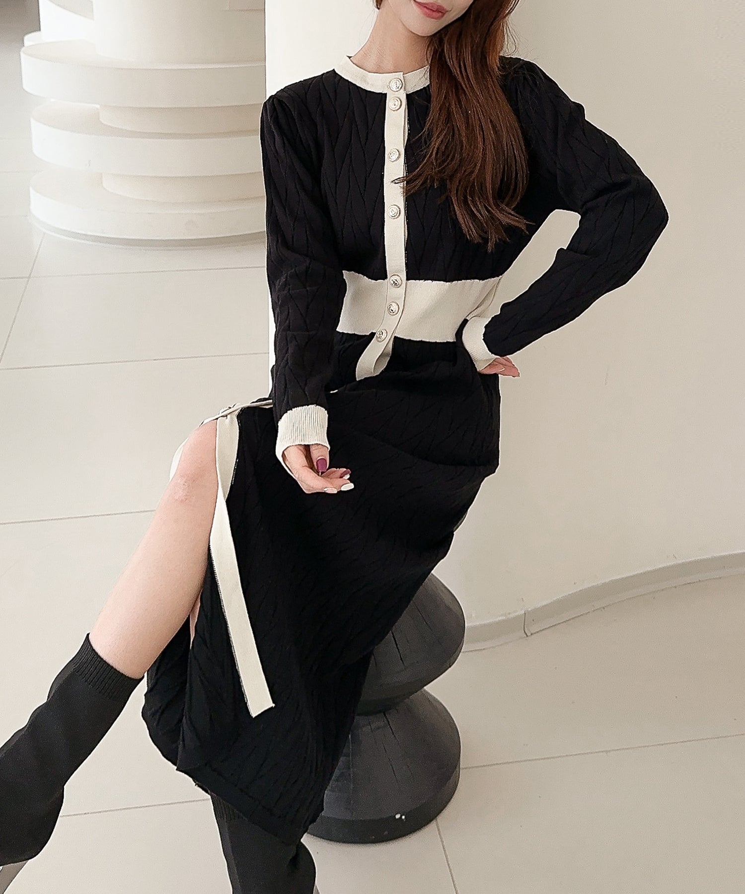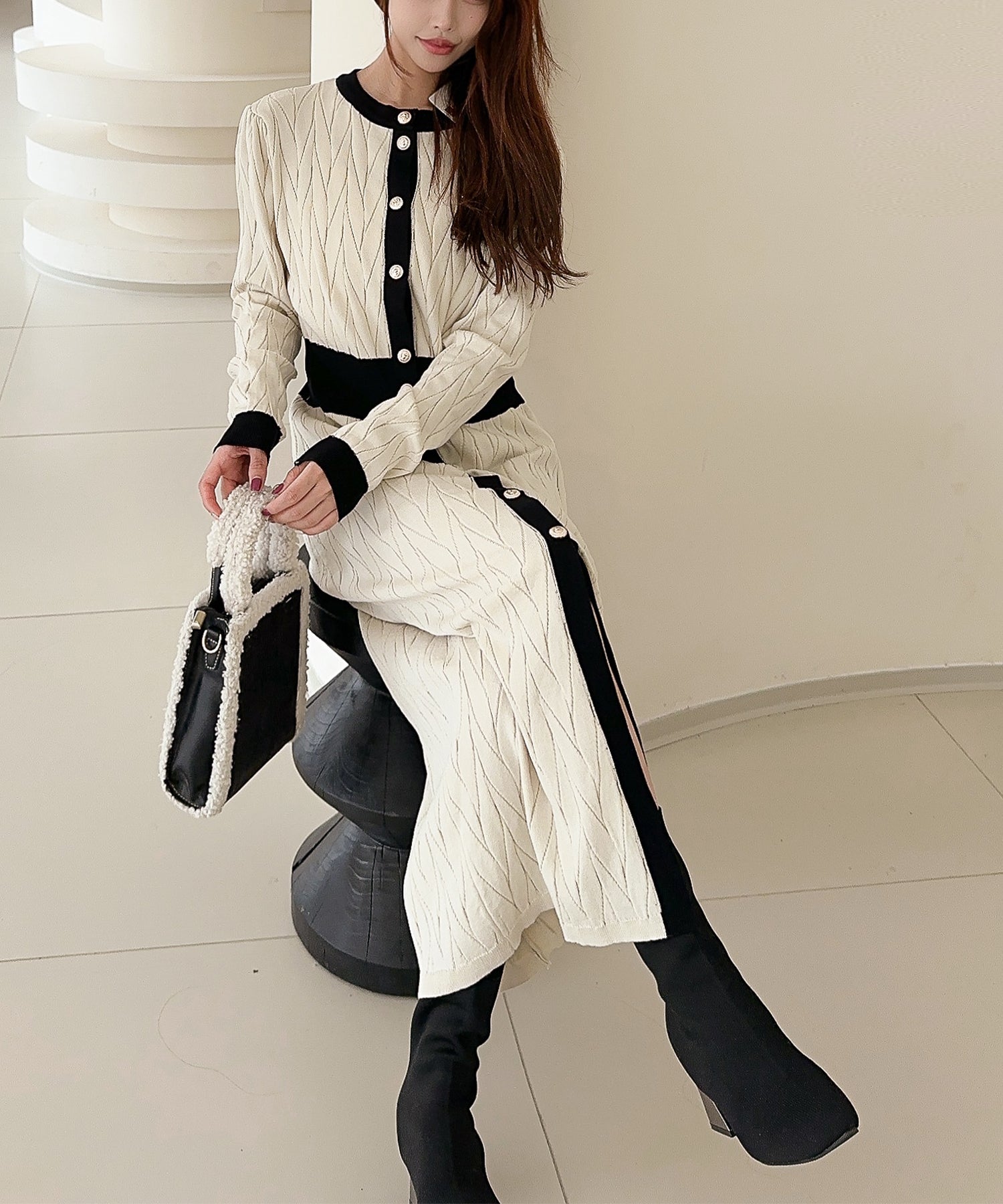 バイカラーのラインが効いた上品クラシカルなデザインのニットワンピ。