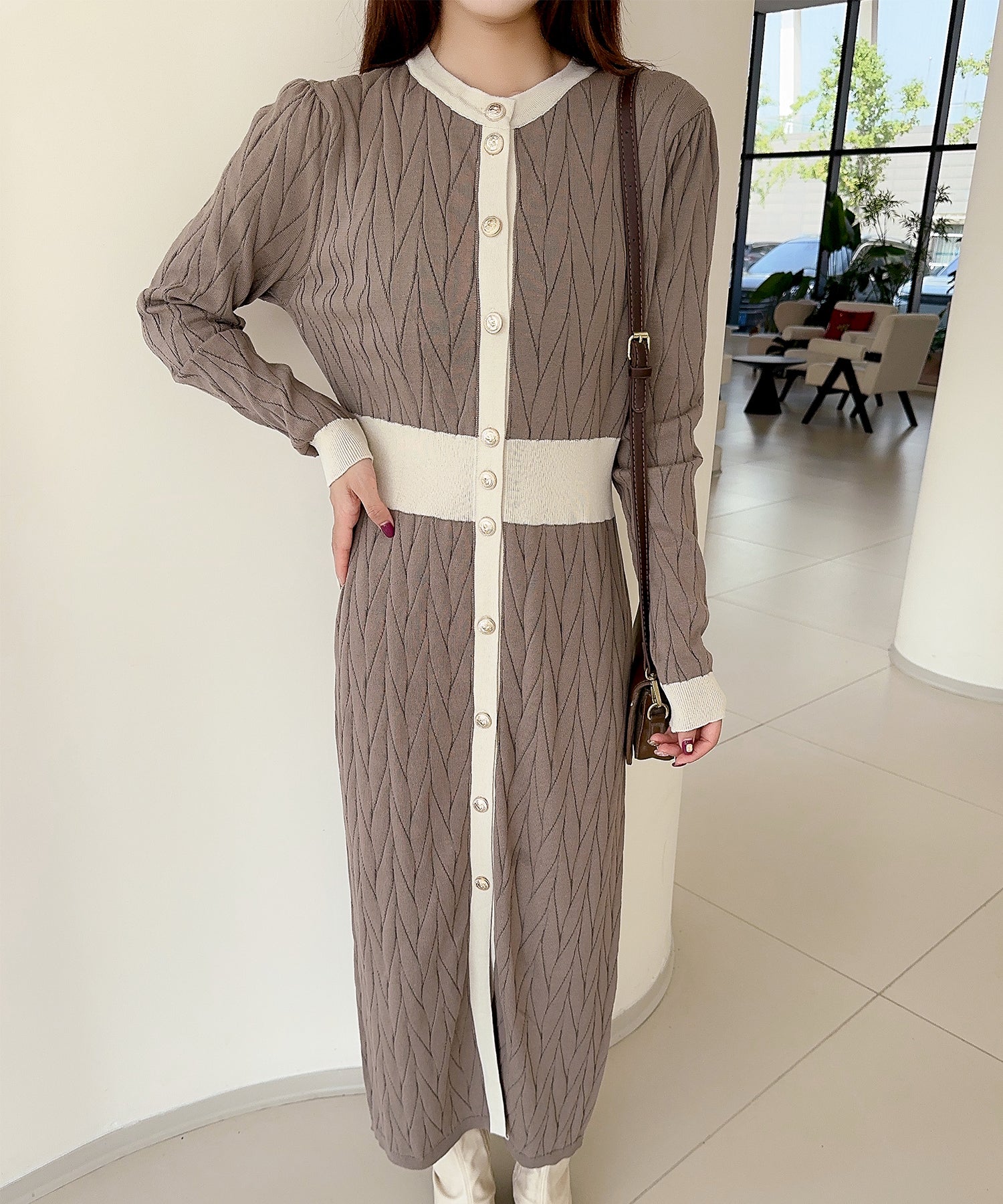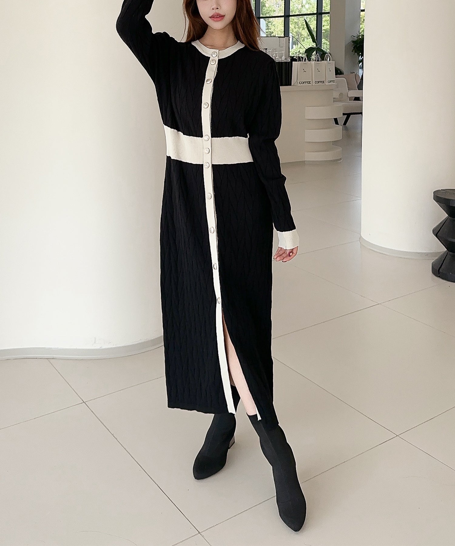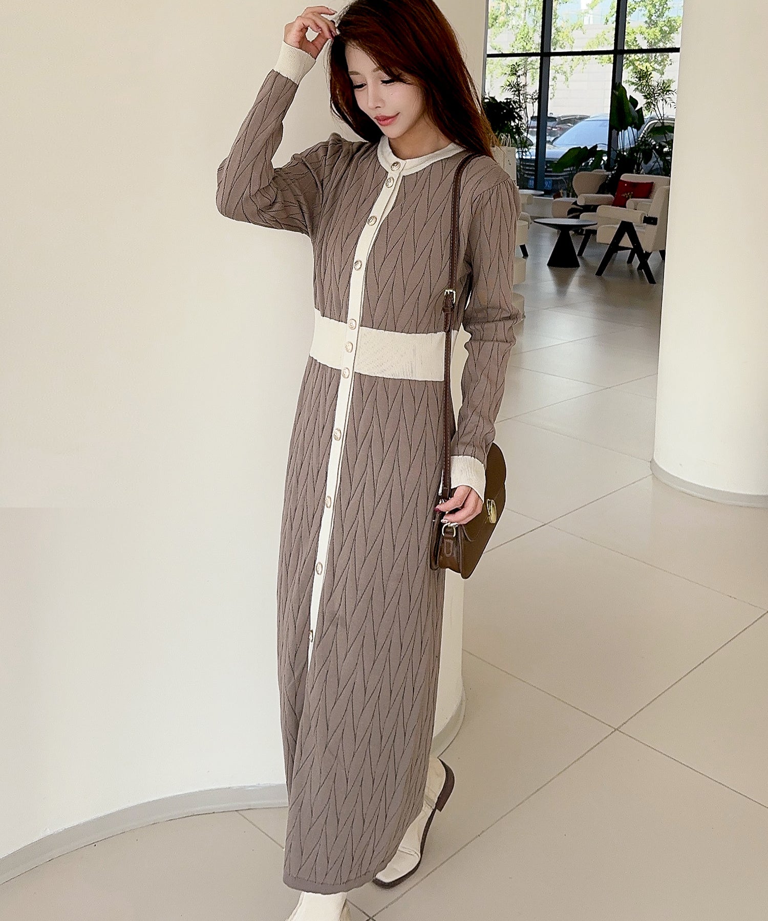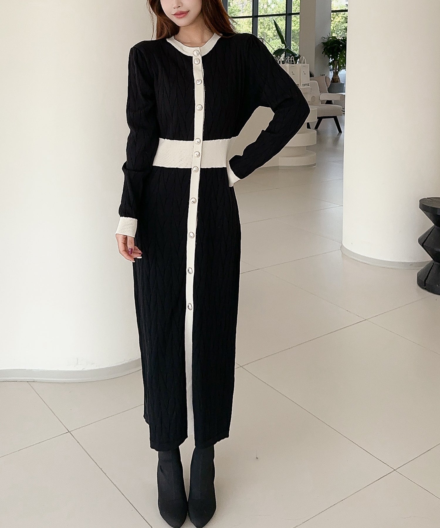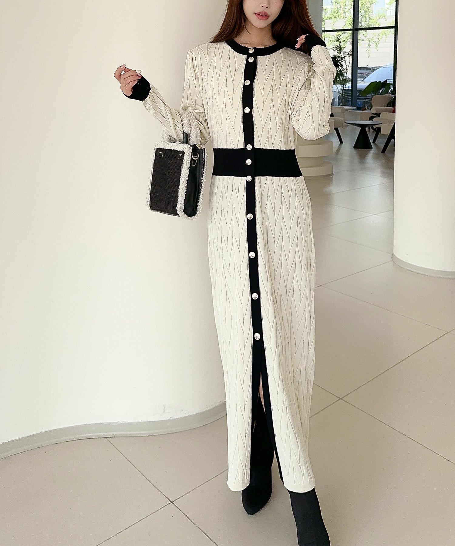 バイカラーのラインが効いた上品クラシカルなデザインのニットワンピ。