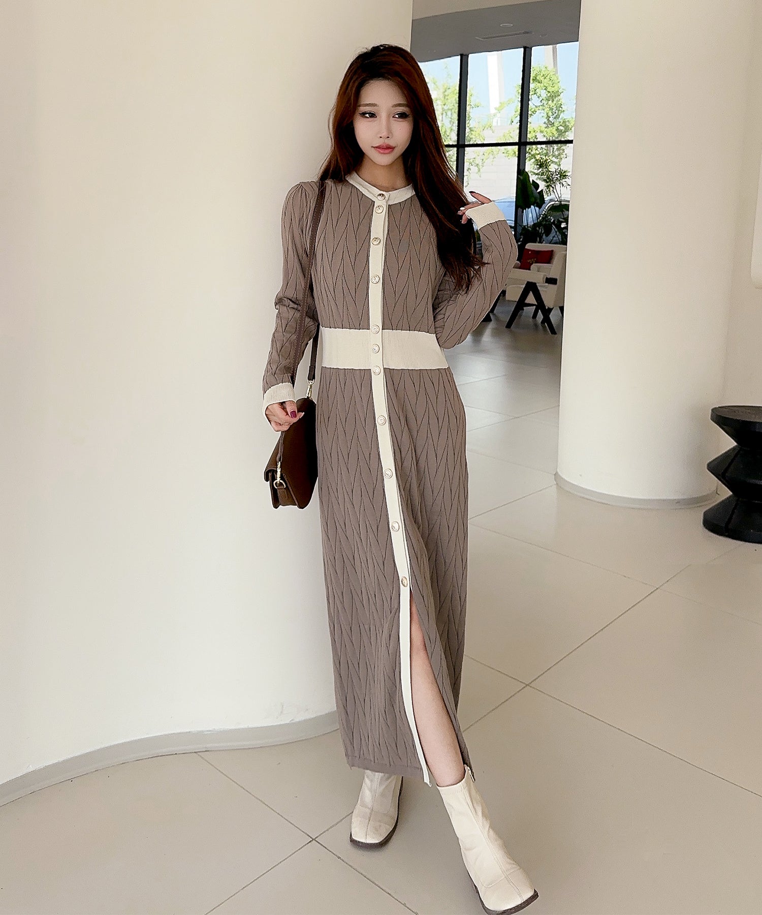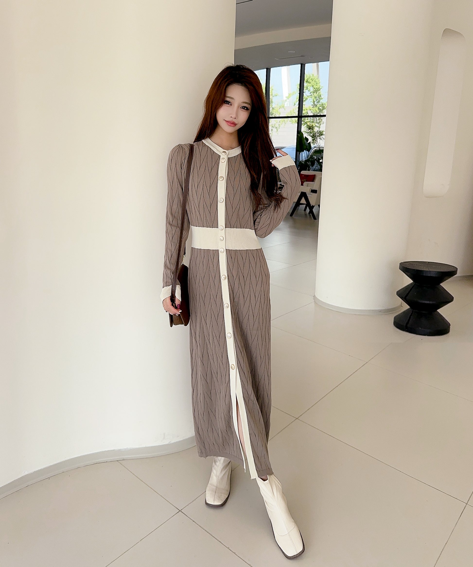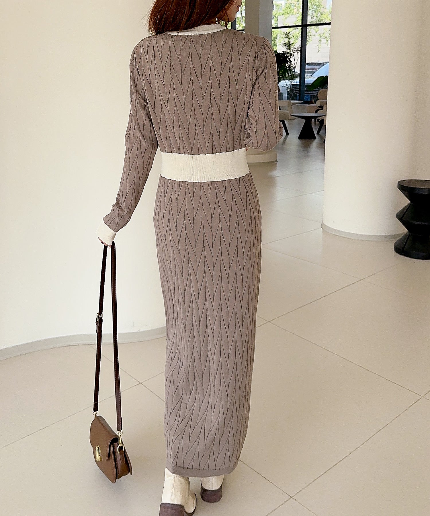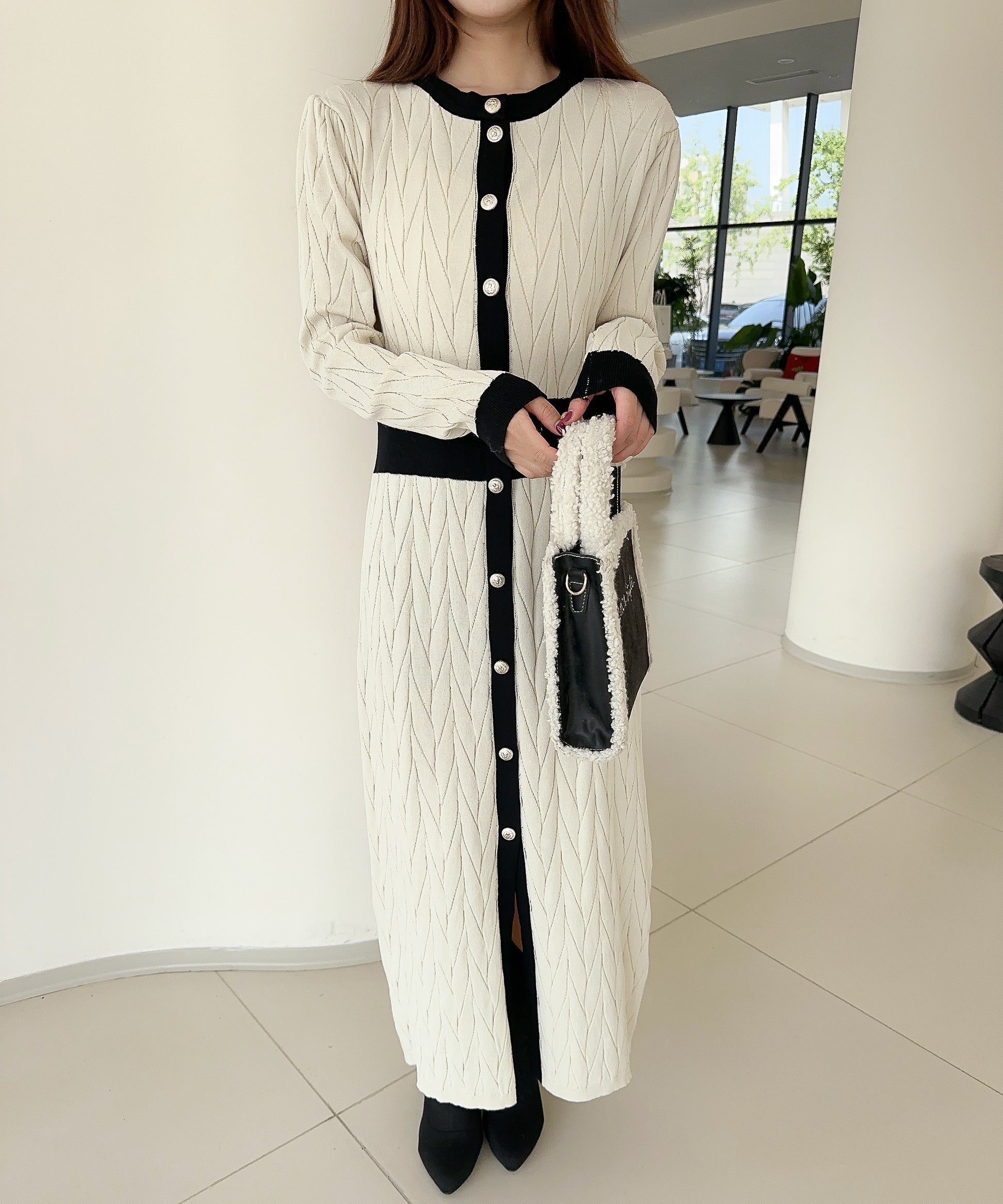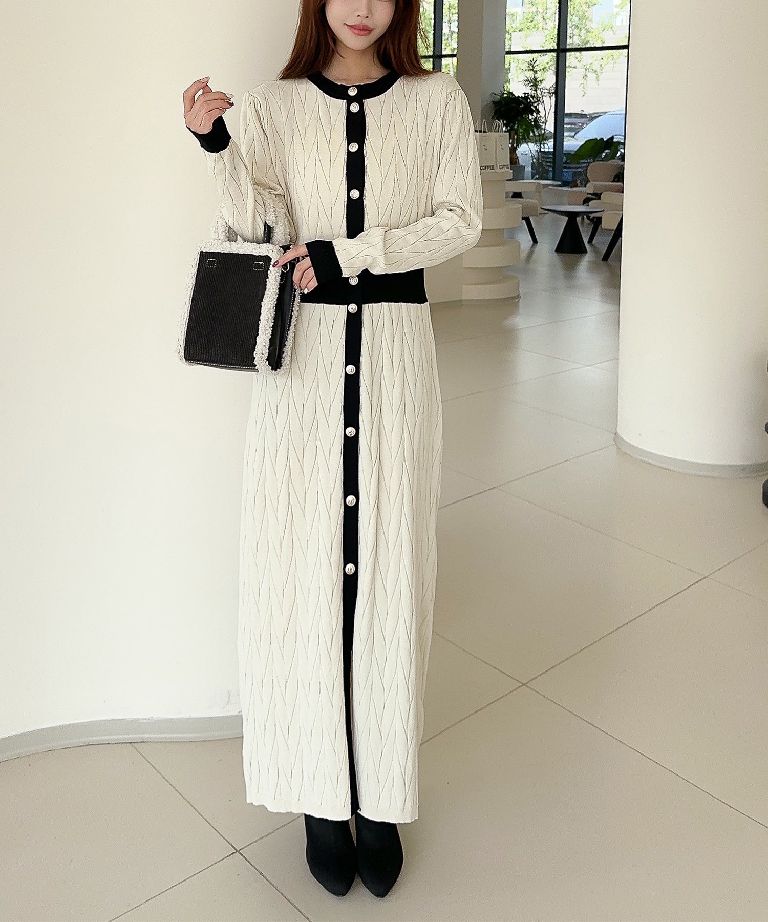 バイカラーのラインが効いた上品クラシカルなデザインのニットワンピ。