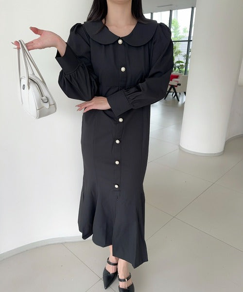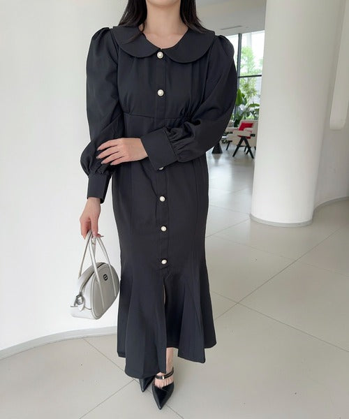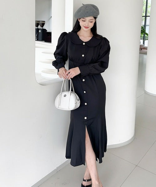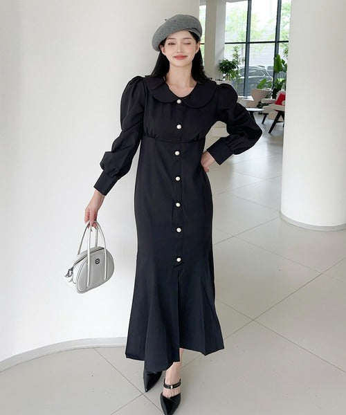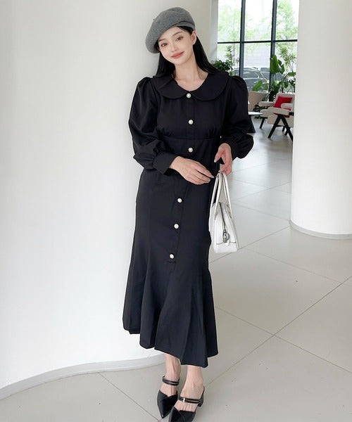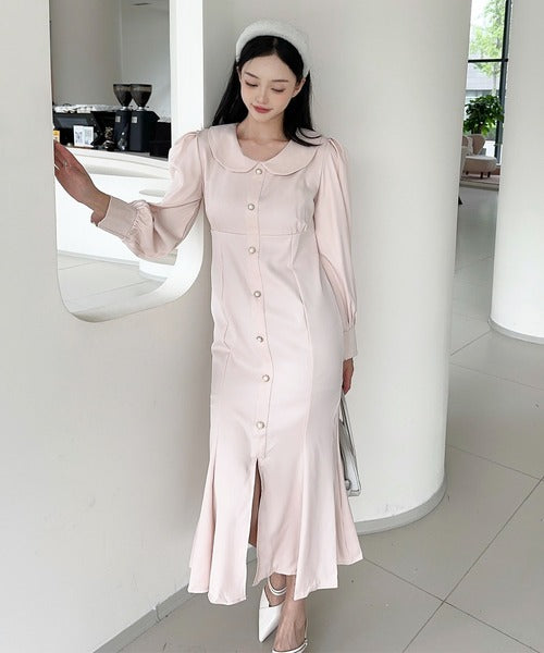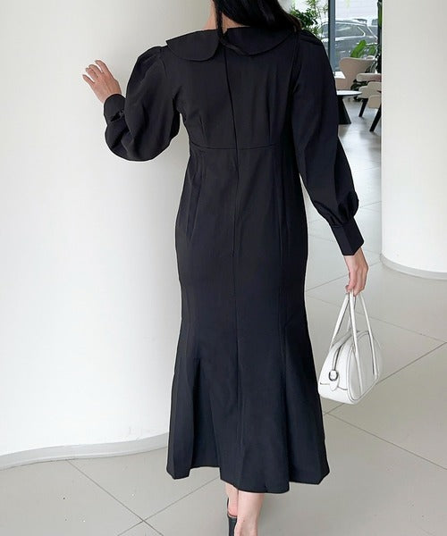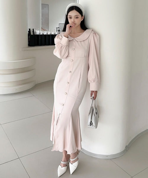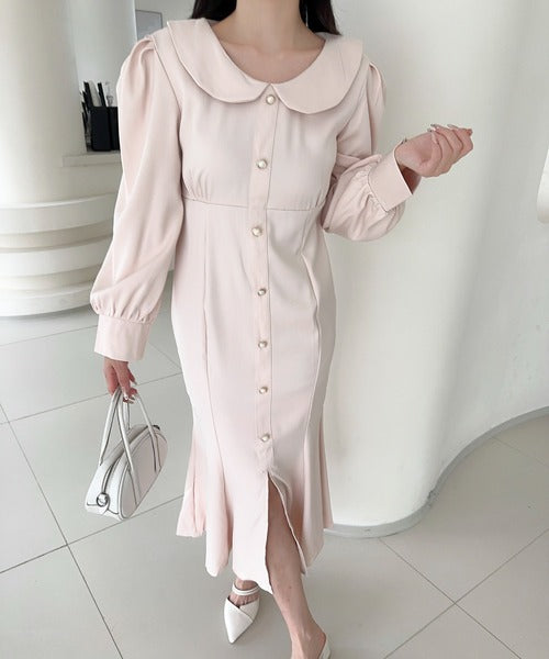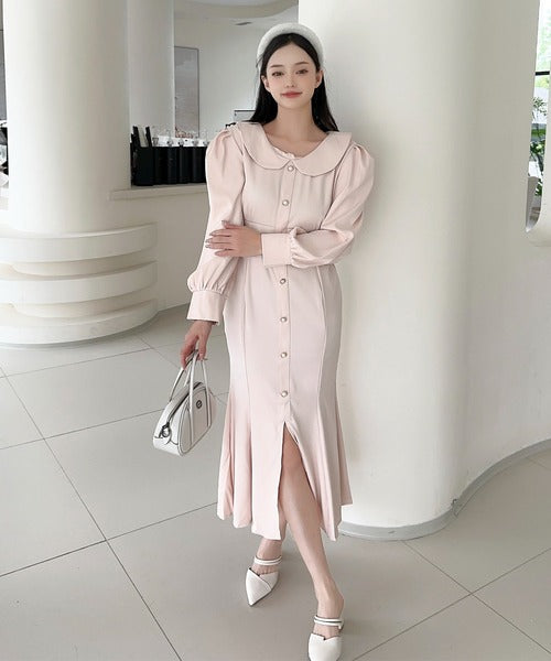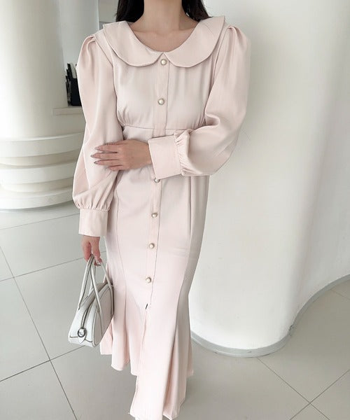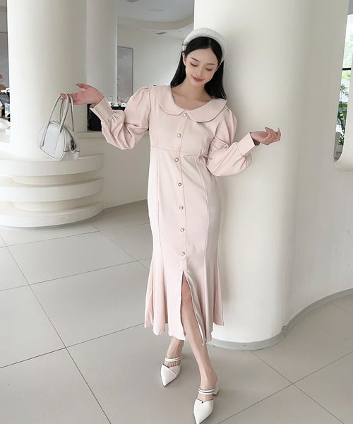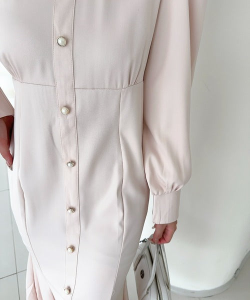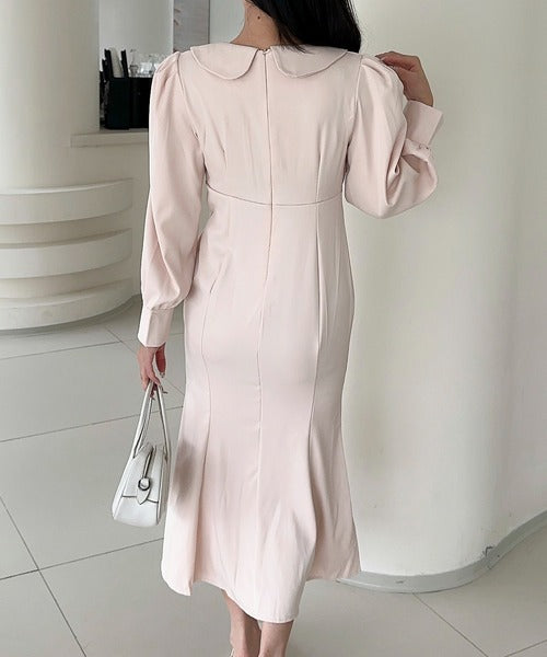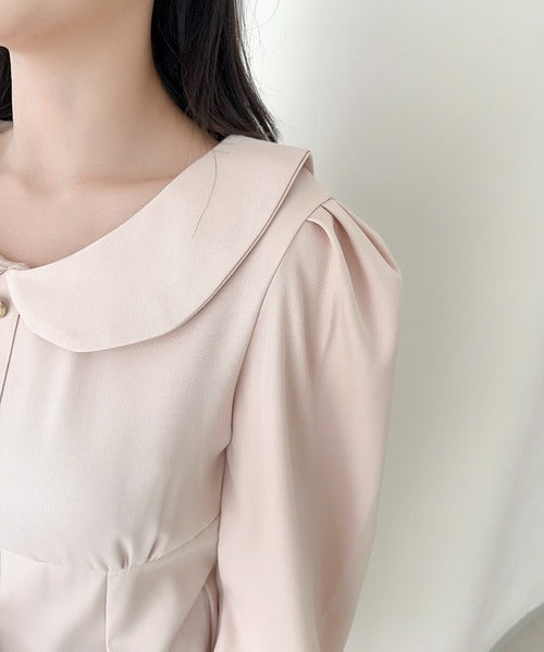 パフスリーブでパワショルっぽくなっている柔らかな雰囲気のワンピースです。