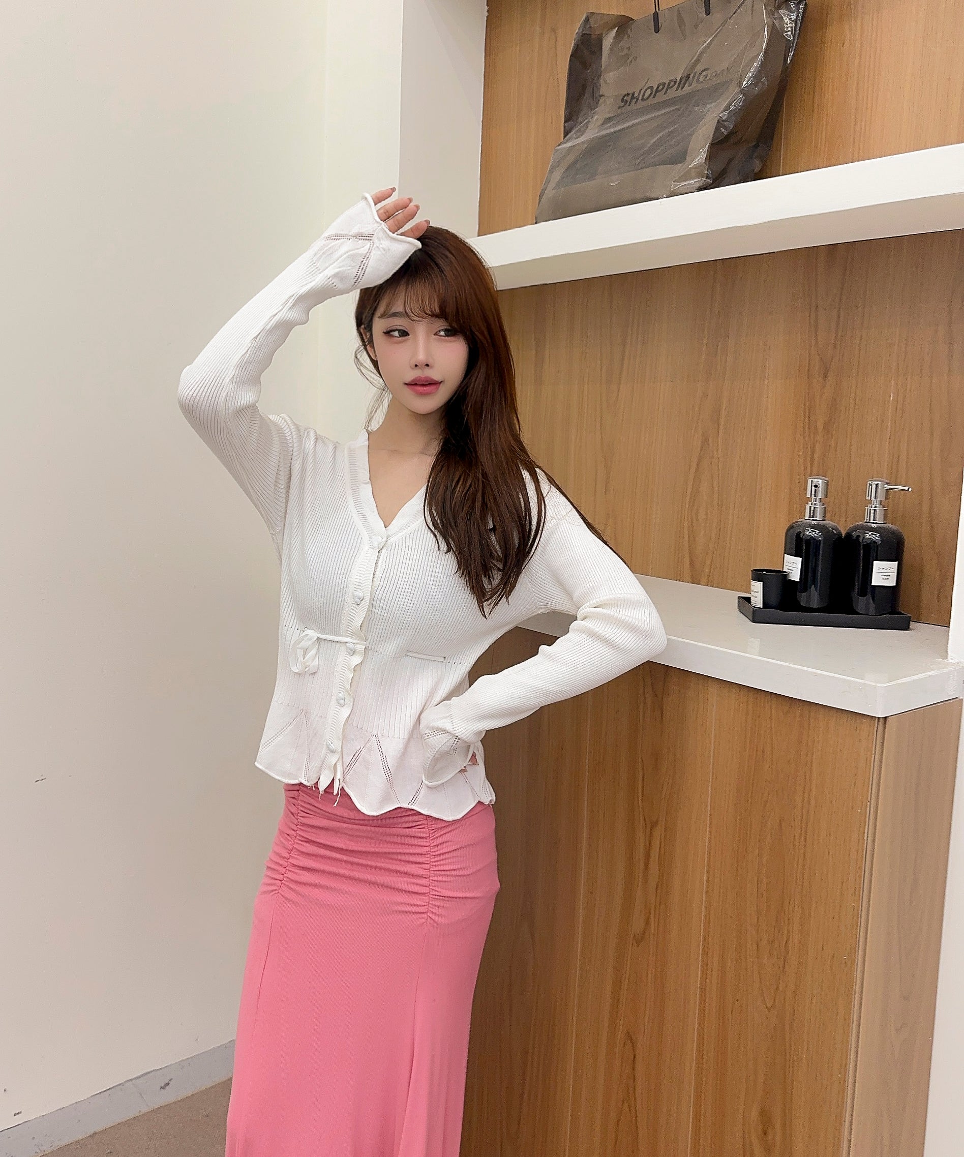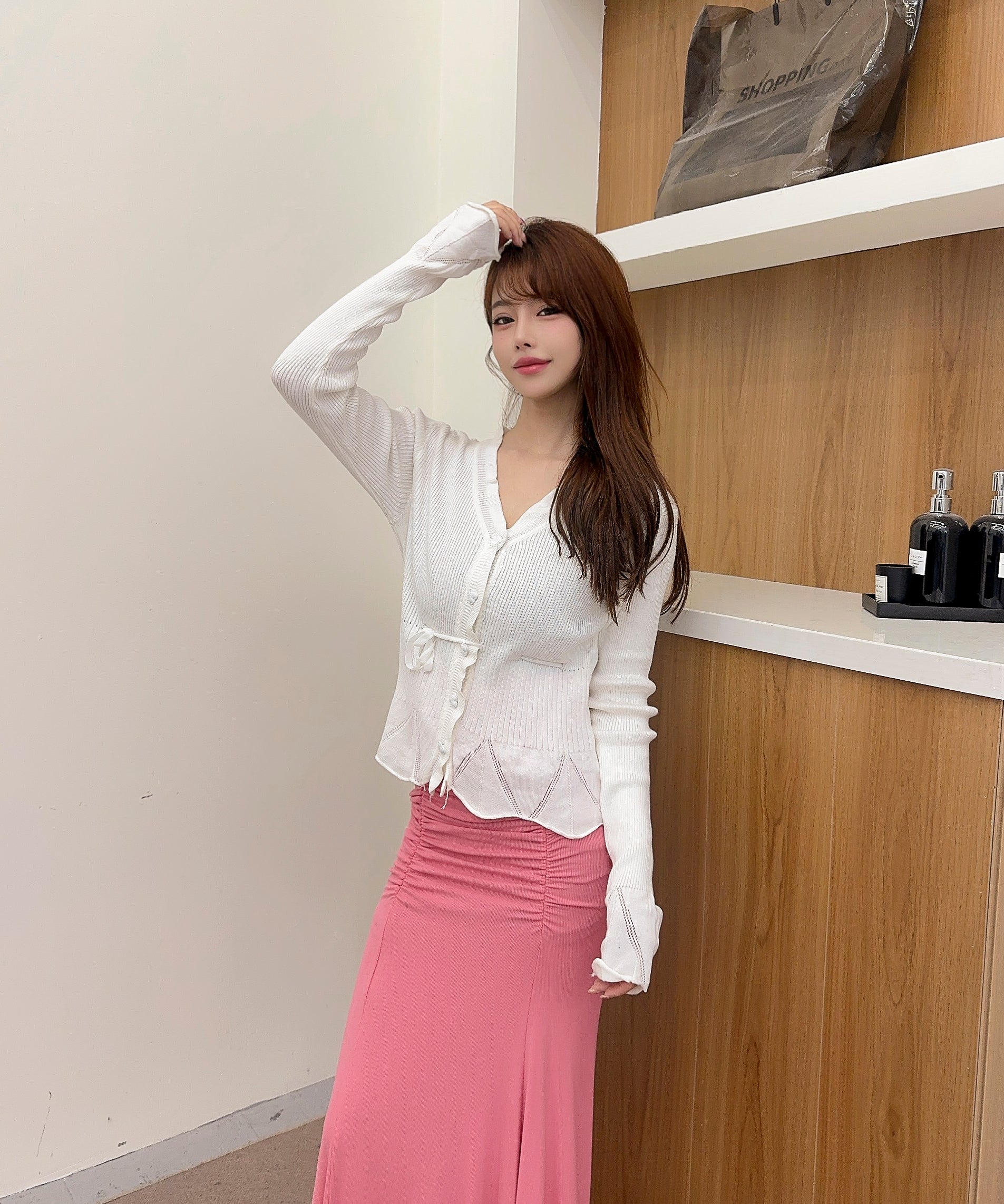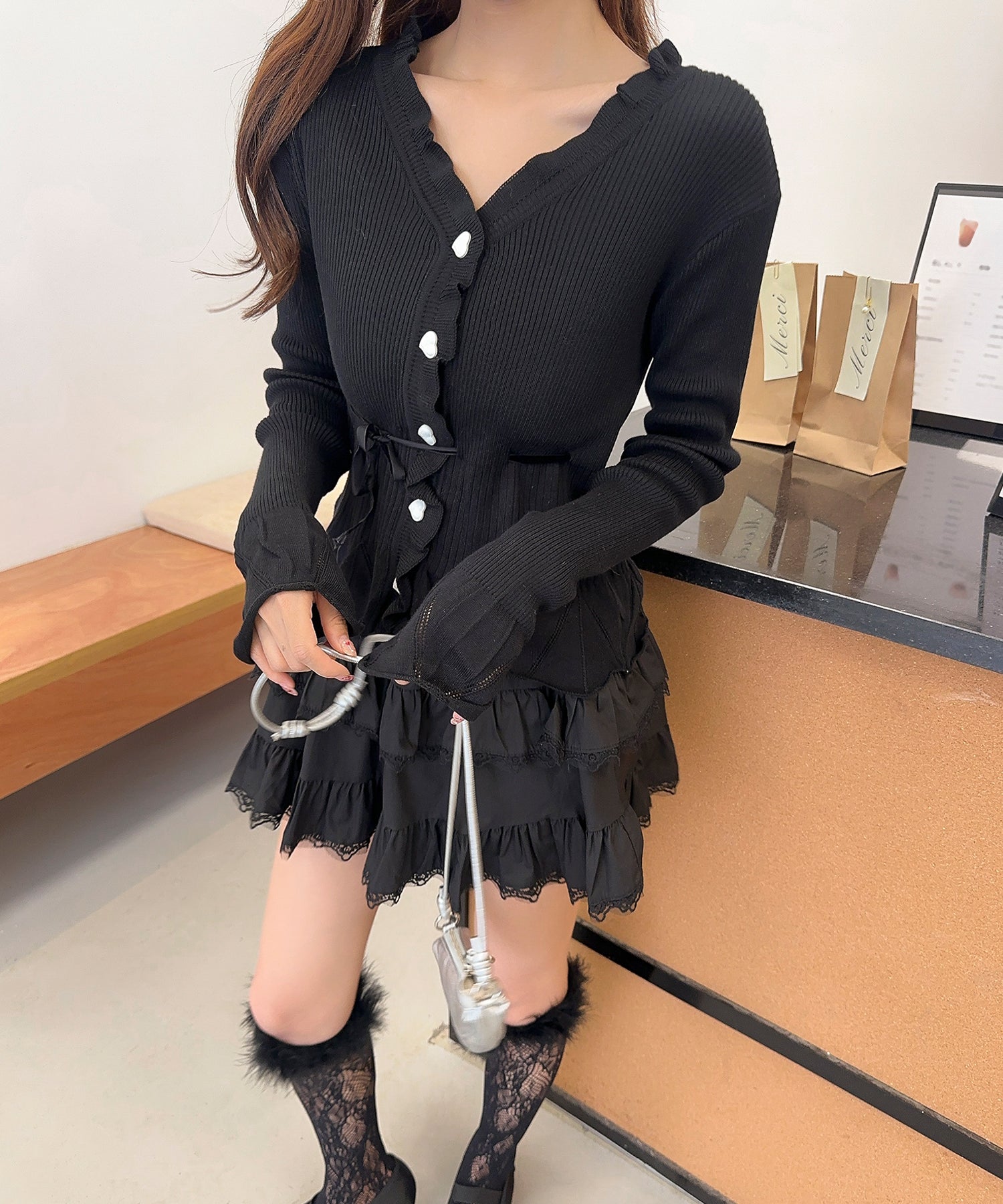 繊細なレース調の透かし編みが施されたニットカーディガン。