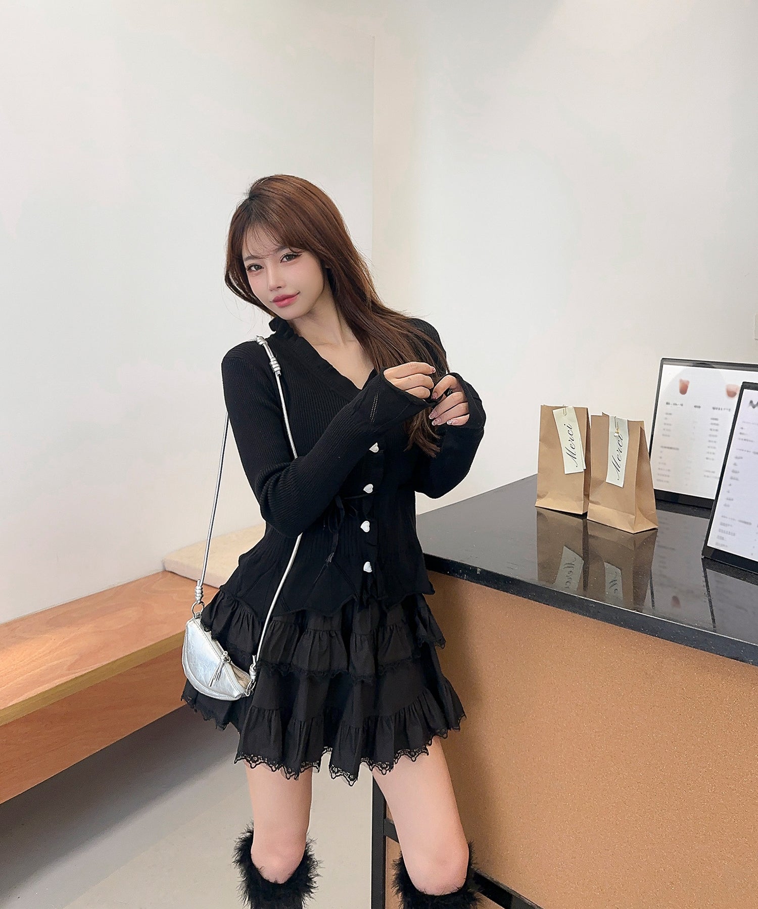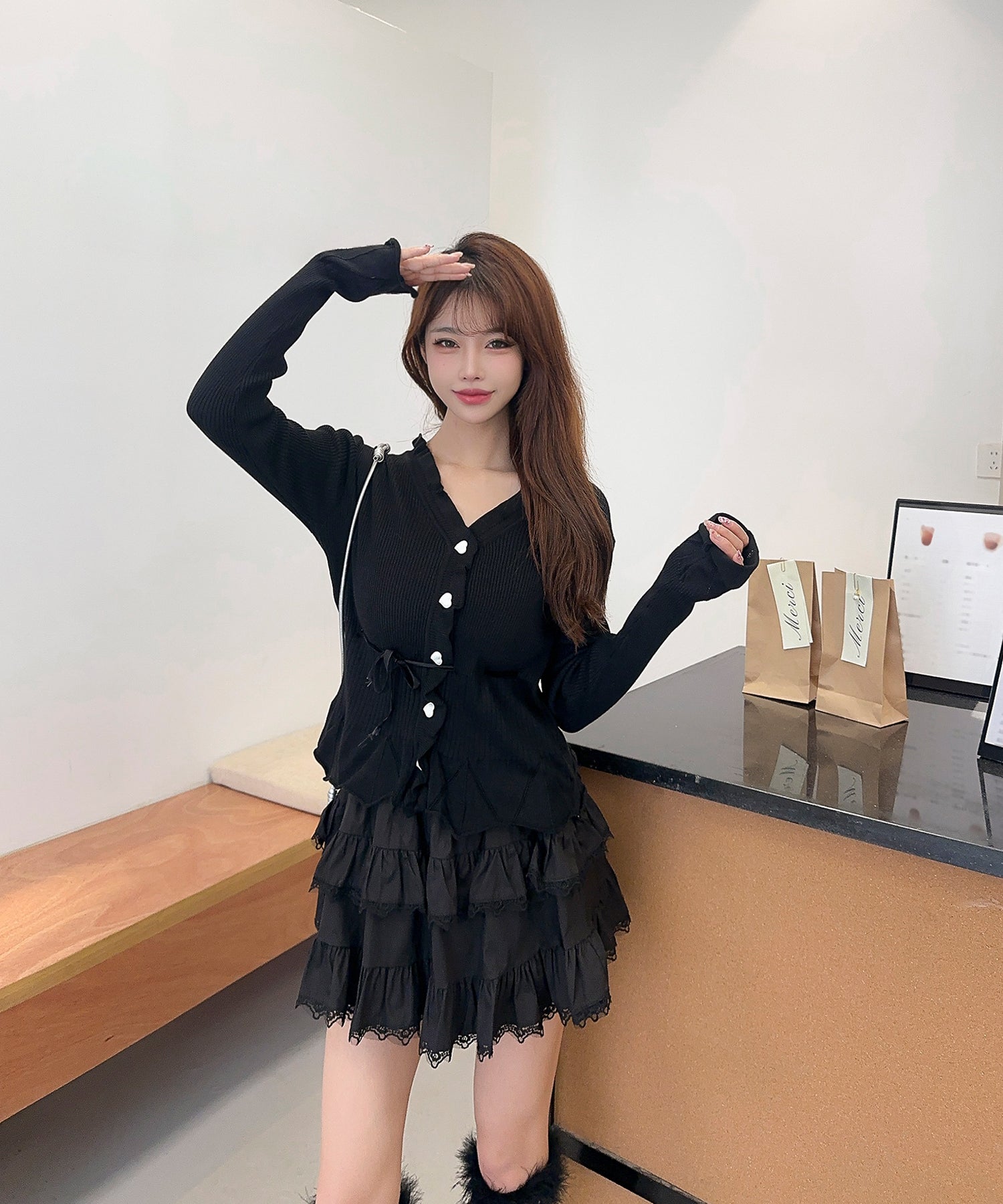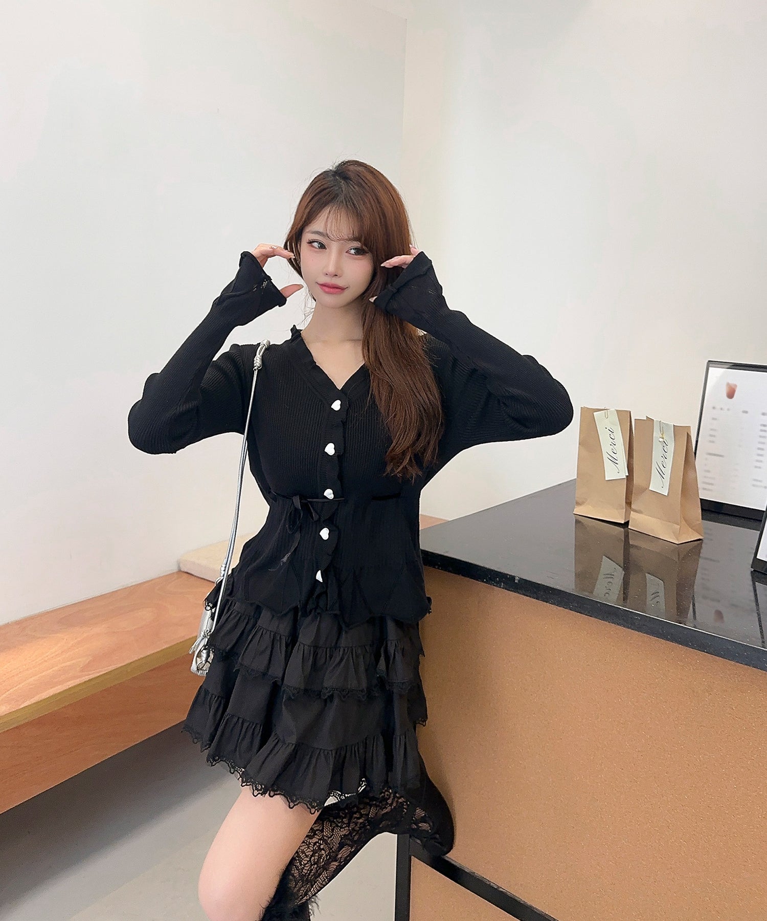 繊細なレース調の透かし編みが施されたニットカーディガン。