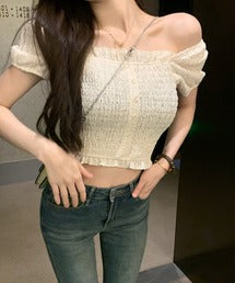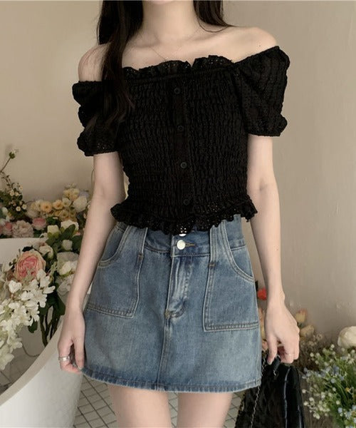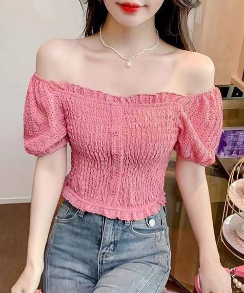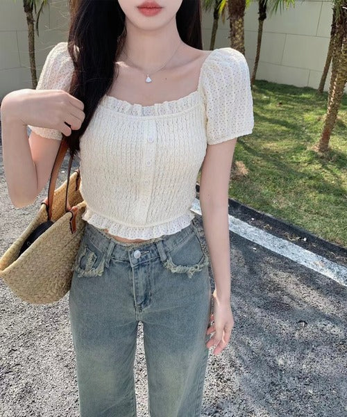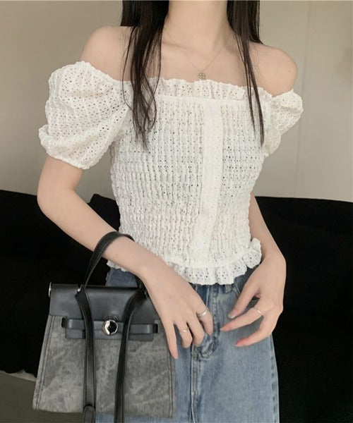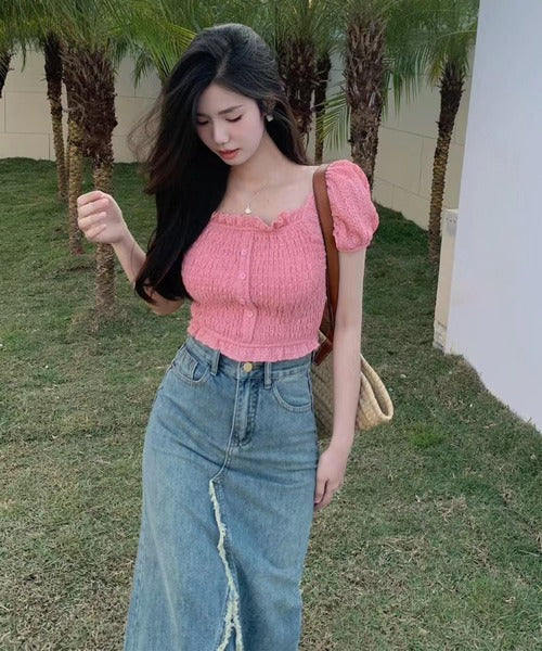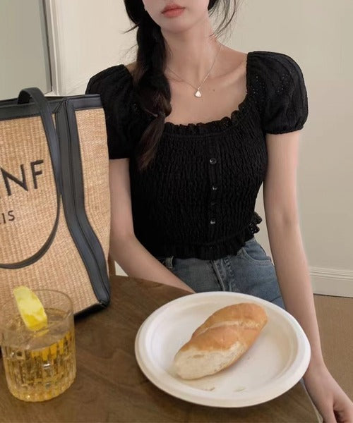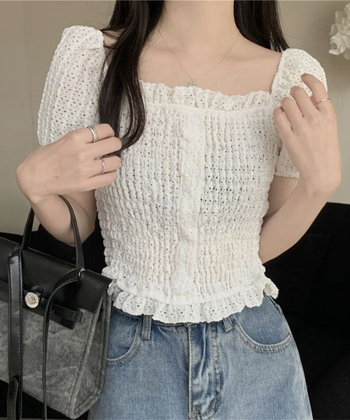 ふんわりとしたパフスリーブと、裾やネックラインにあしらわれたフリルデザインが、ガーリーな印象を引き立てます。