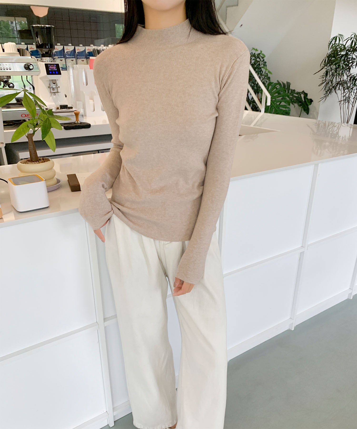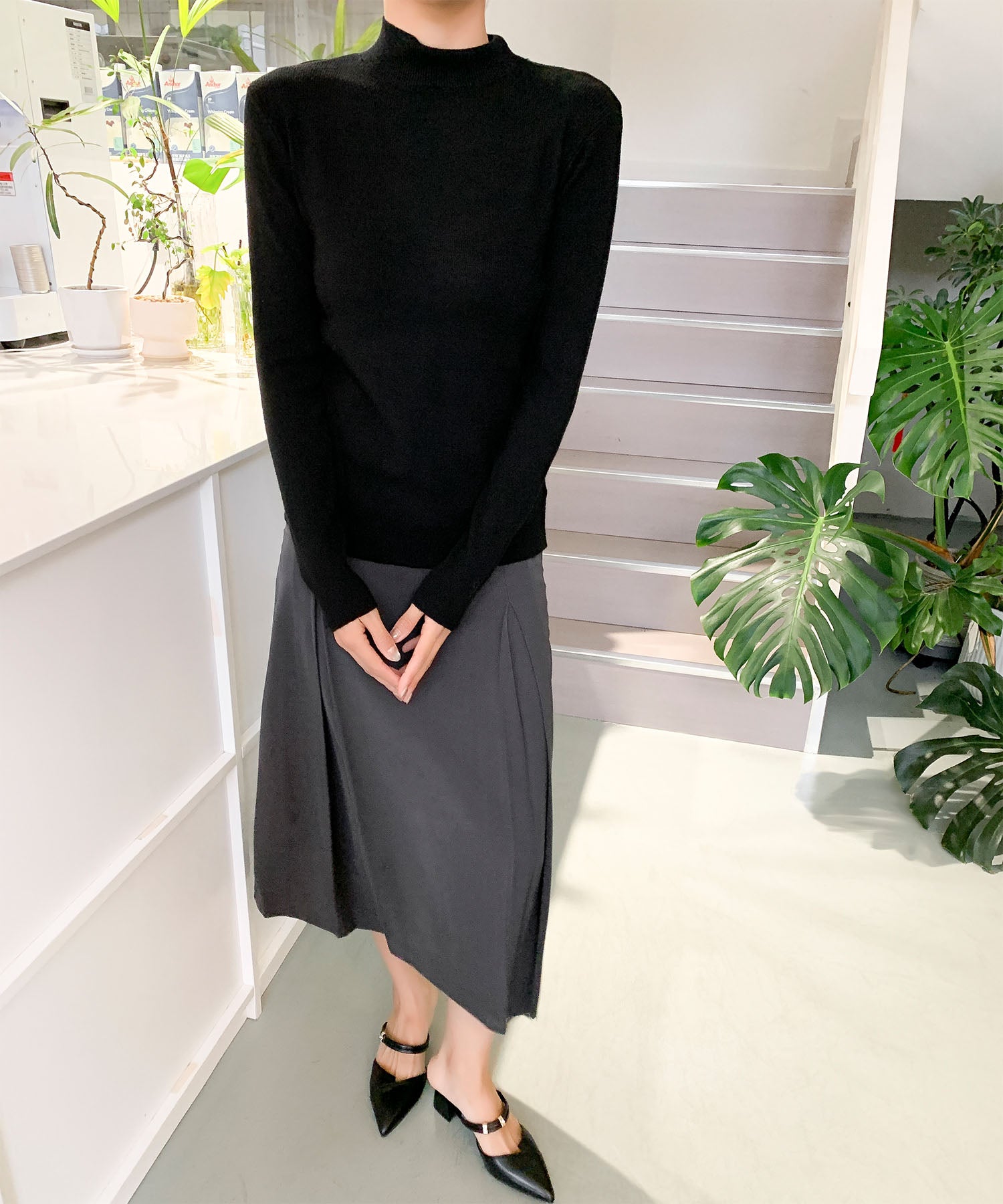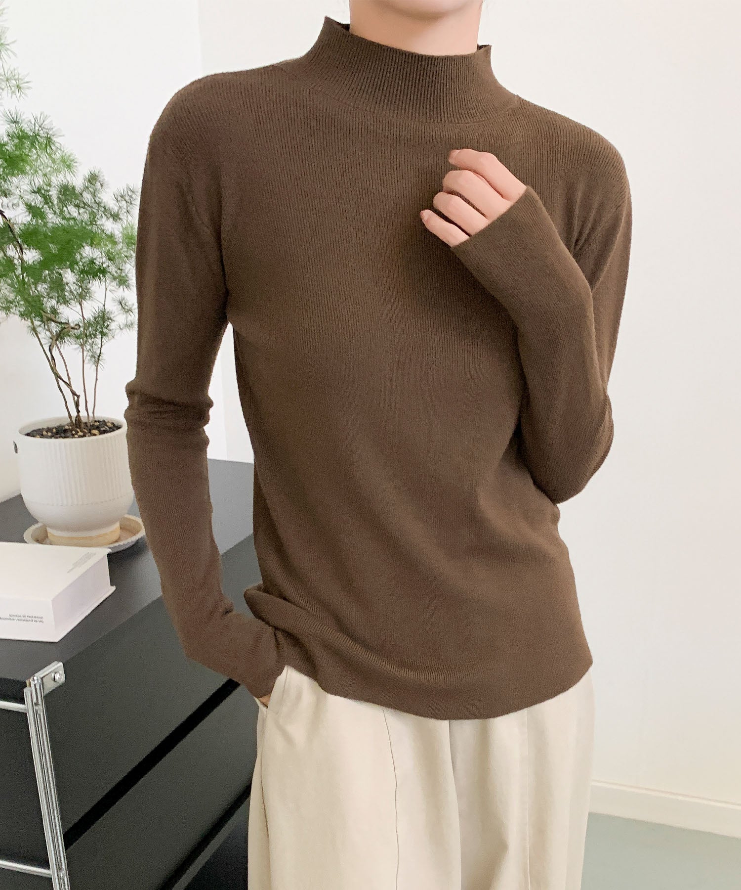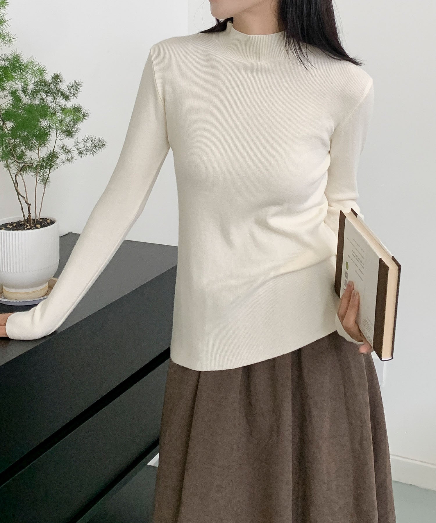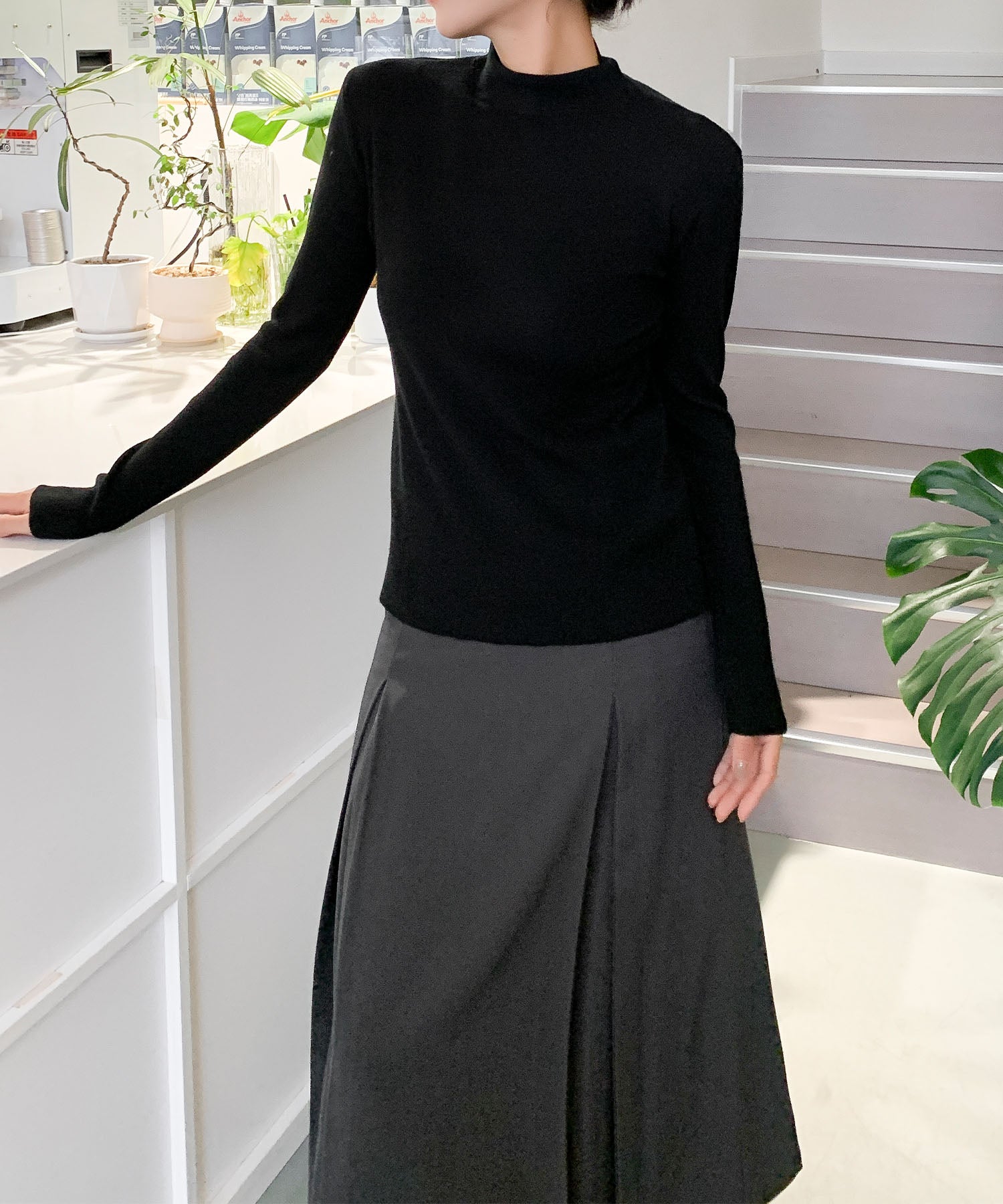 立ち襟の程よいアクセントが首元をすっきり見せ、ジャケットのインナーにも一枚着にも対応可能。季節の変わり目から秋冬シーズンまで、幅広いシーンで重宝します。
